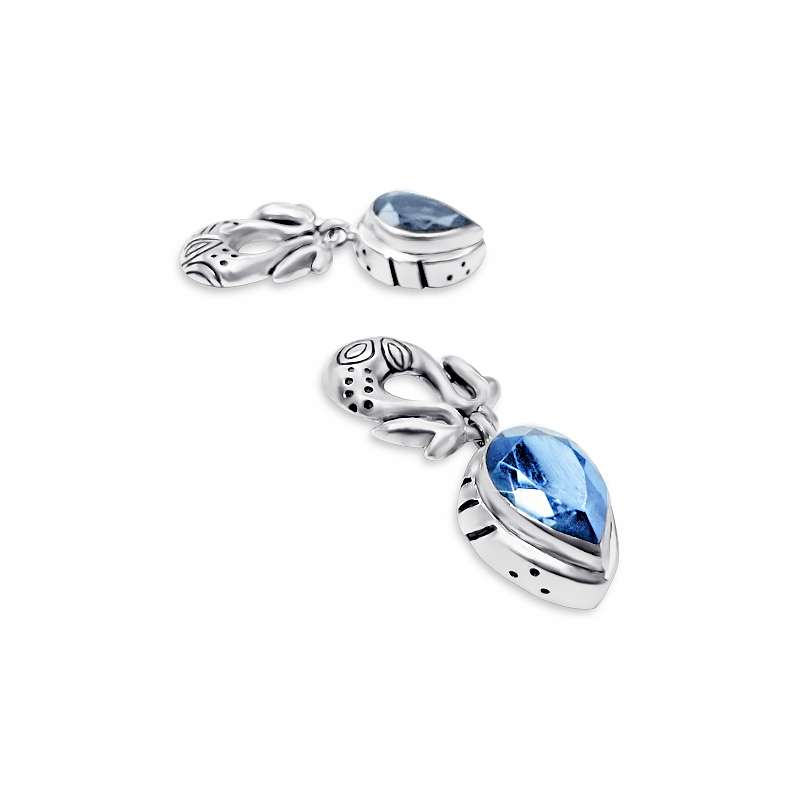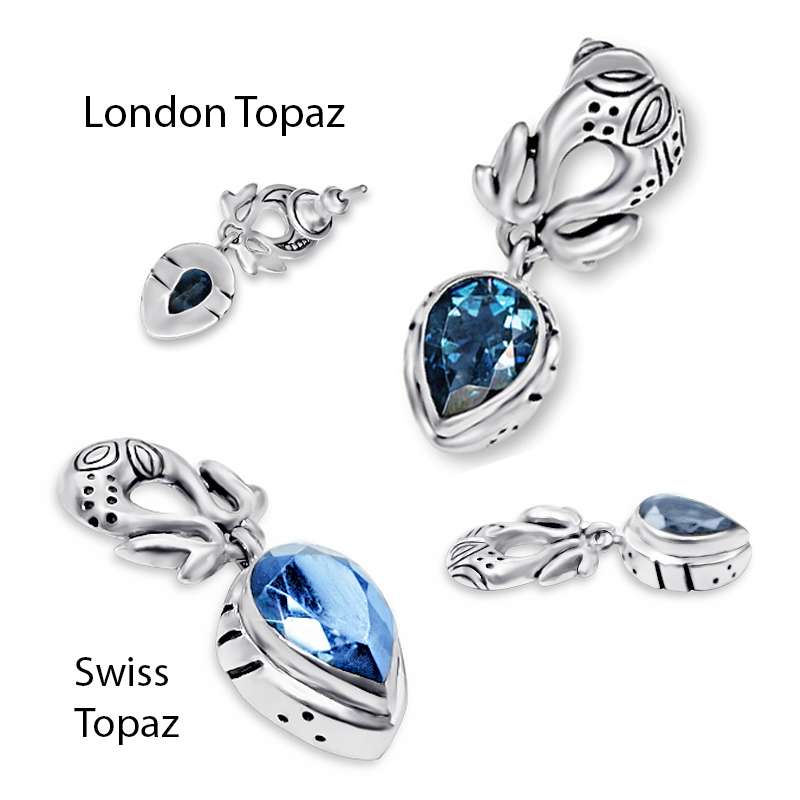 Handcrafted in sterling silver, these earrings feature natural pear-shaped London Blue Topaz or Swiss Topaz gemstones. London Blue Topaz captivates with its deep, rich blue hue with subtle gray undertones, while Swiss Topaz shines with a vibrant sky-blue brilliance. Delicate engravings and oxidized accents enhance the silver’s texture, adding depth and character.
