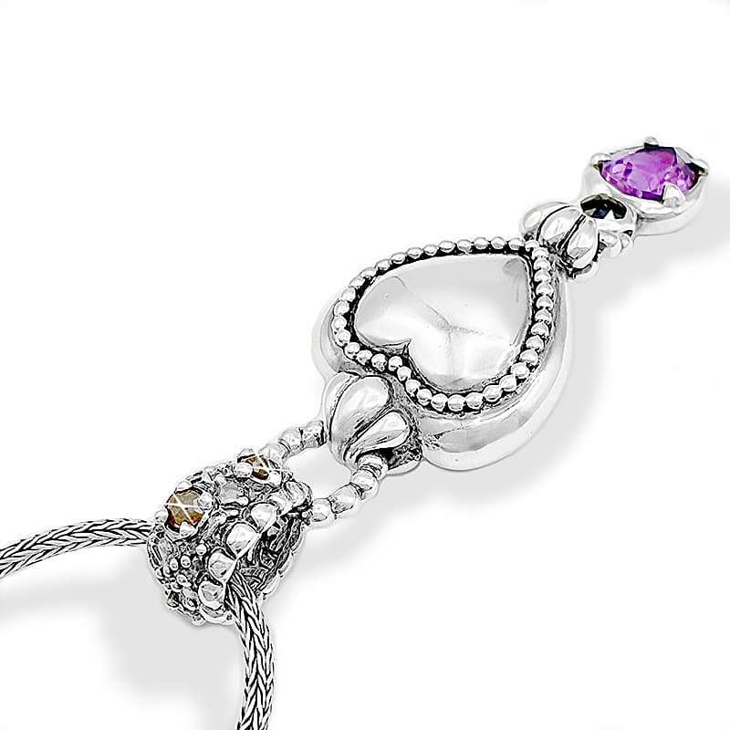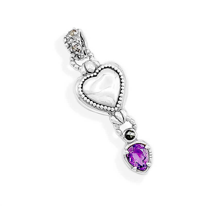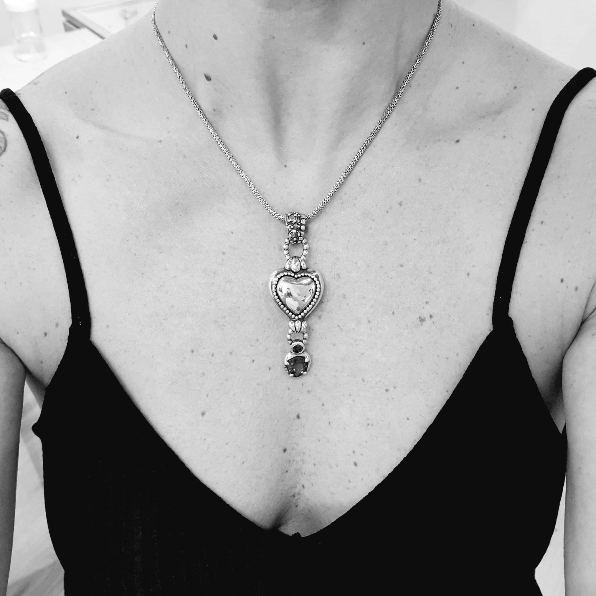 The Arsi Heart shaped Pendant it’s inspired in the traditional Arsi Mirror Rings. This one has a dropped amethyst at the bottom together with a black diamond and smaller rough diamonds rose cut at the back and the upper ring. Both sides are different and wearable!