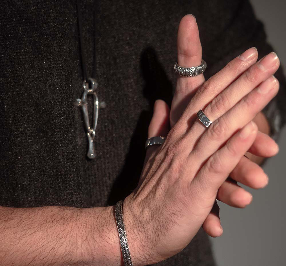 The contrast between polished silver and darker recessed areas enhances the details, emphasizing the handcrafted process and the precision of the carving. With its solid construction and expressive design, this ring stands out as a statement piece that combines cultural inspiration with strong artisanal identity.