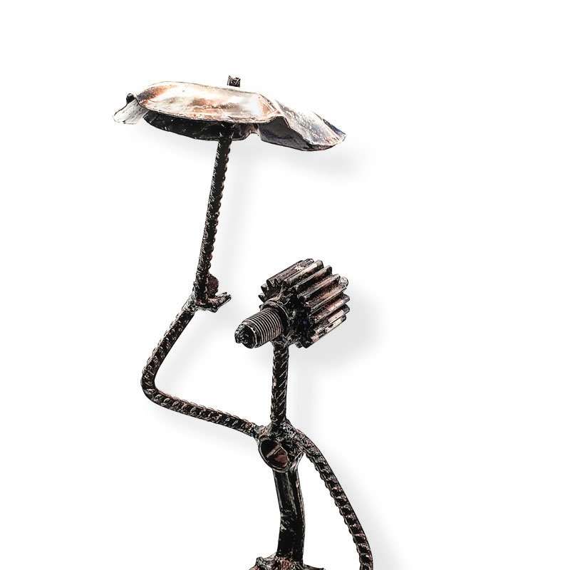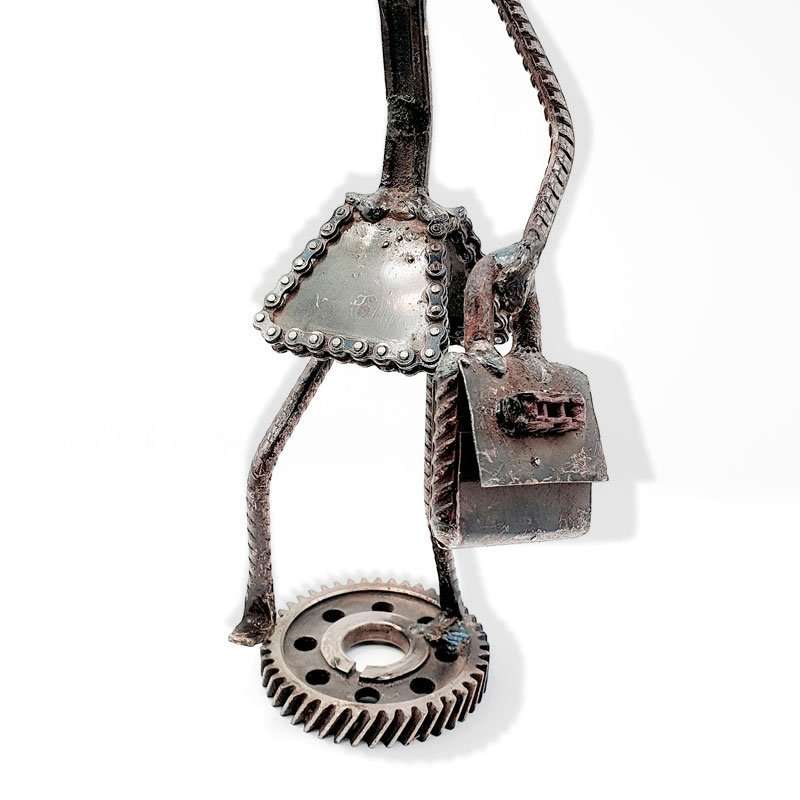 He uses old engines parts, abandoned bicycles, and destroyed tools that he finds walking around town to create sculptures.
