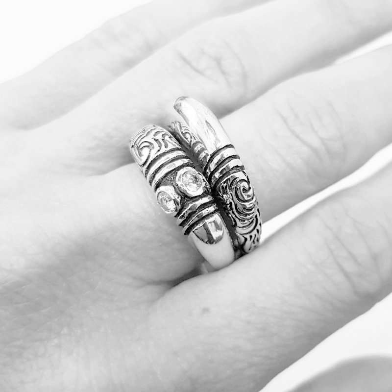 Double Mountain Tribes Ring + stones. Silver and Sapphires. 2 rings joint at the bottom