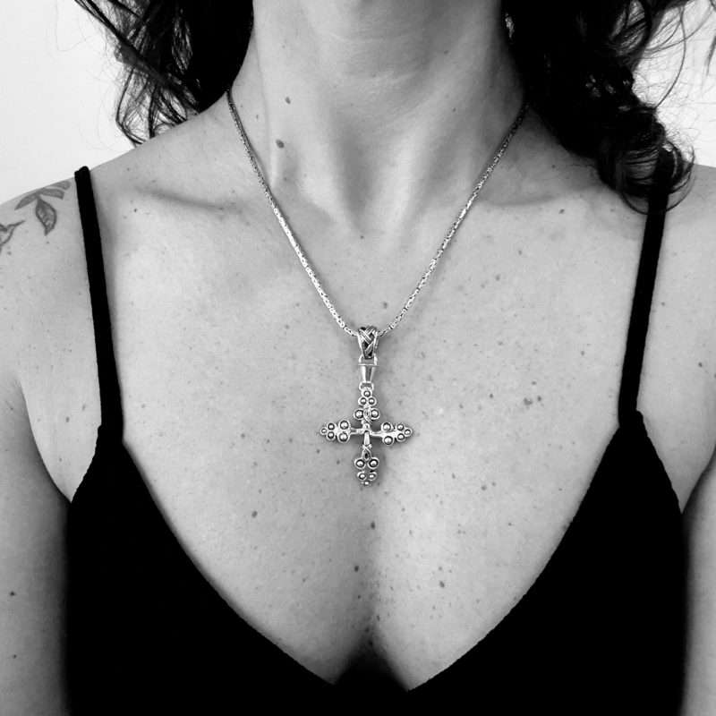 The Ethiopia Cross Pendant is inspired in classic Coptic Crosses from Ethiopia. Is articulated, giving the piece flexibility and smoothnes. Both sides are a bit different, switch them every time. Total length is 60mm and 35mm width. In the remote highlands of Ethiopia, the Habesha Christians have lived for over 1000 years isolated from the world. Throughout these centuries, religion has been central to their culture. Its origins can be traced back to Coptic Christians from Egypt who came to Ethiopia in the 4th century. The cross has always been a symbol of great significance. Latin and Greek crosses, characterised by simple and clear lines, were enriched by Coptic designs. These are generally more complex and feature intricate protuberances on the sides. To this day, Christian Habesha wear crosses around their necks, often on a dark cotton thread, called mateb.