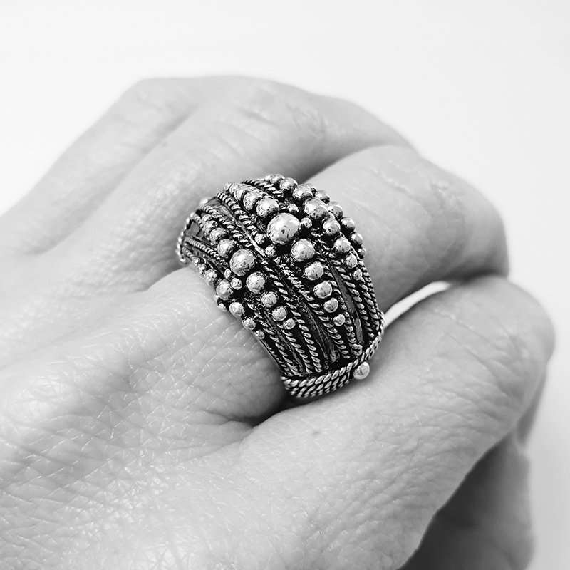 The Gelang Sarong Silver Ring is handmade in silver with Wires and balls decoration. Inspired in Karo Tribes Jewellery