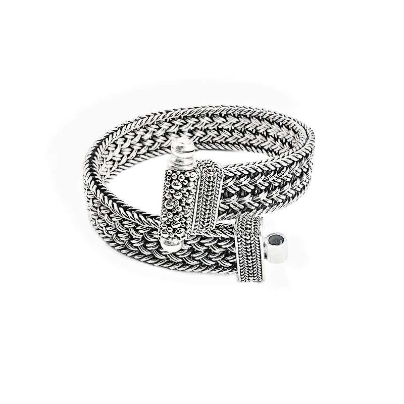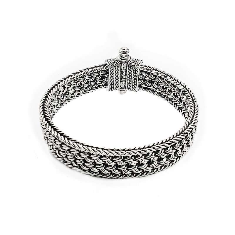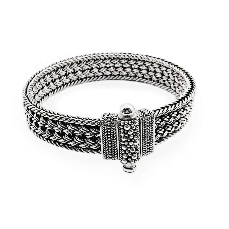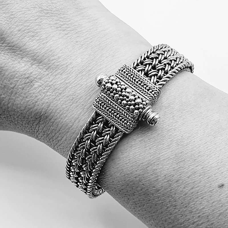 The granulation Silver Bracelet is made by hand weaving thin silver wires. It’s width is 12mm and the closure is unique. Every little ball and braid was hand placed: welding details this small is very hard. The skilled Indonesian artisans perfectioned the granulation techniques over generations. They use an ingenious technique that instead of welding the sheets, they use it as powder.