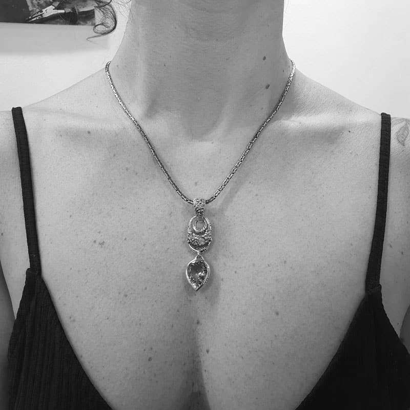 This Handcrafted silver pendant belongs to the Multiring Collection. Decorated with sapphires, topaz, aquamarines and dark diamonds, and a dropped green quartz at the bottom. Total length is 55 mm and 14mm width.