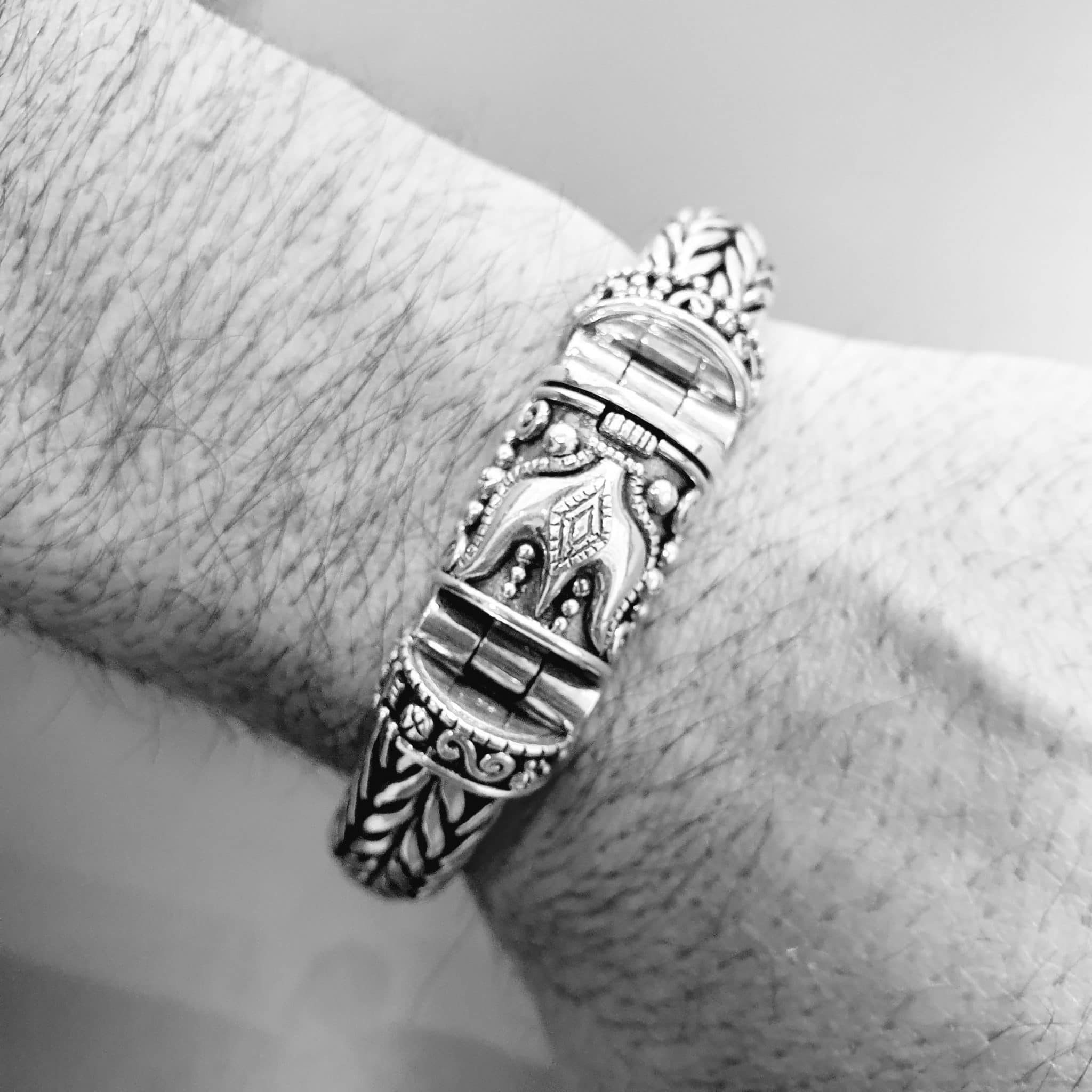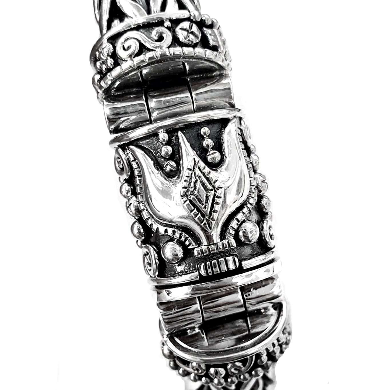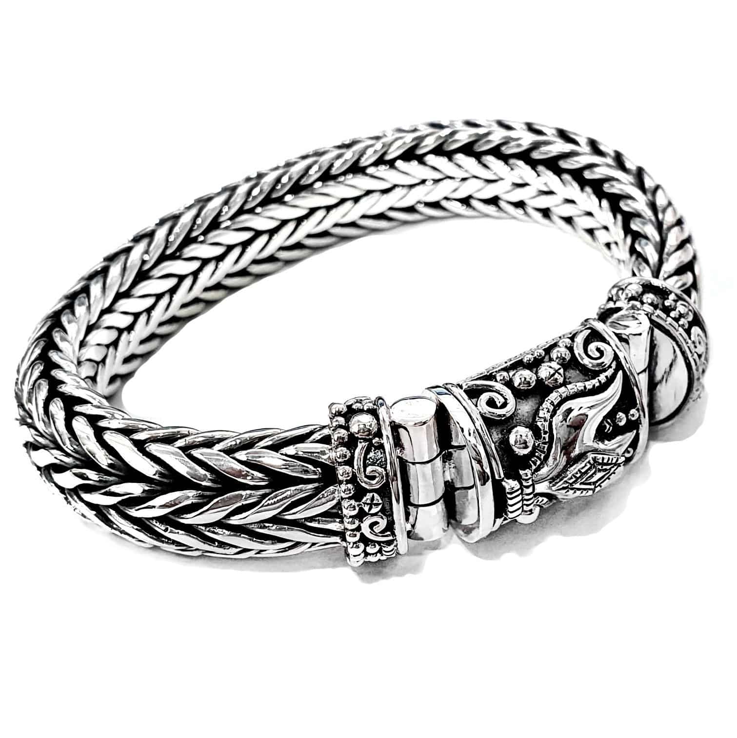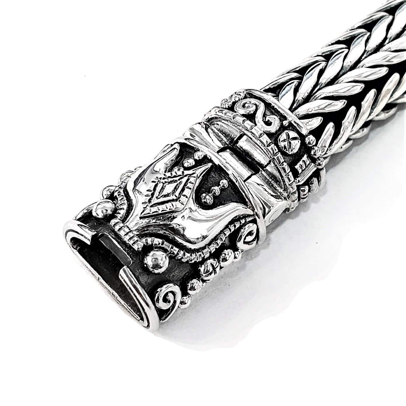 Handweaved silver bracelet with unique Singa Style closure. 10mm width chain. The chain was made completely by hand using traditional techniques consitising on making a specific size of silver rings and braid them is a determined way. A truly art.
