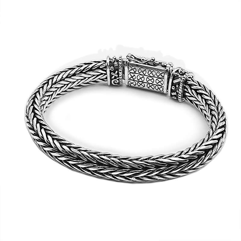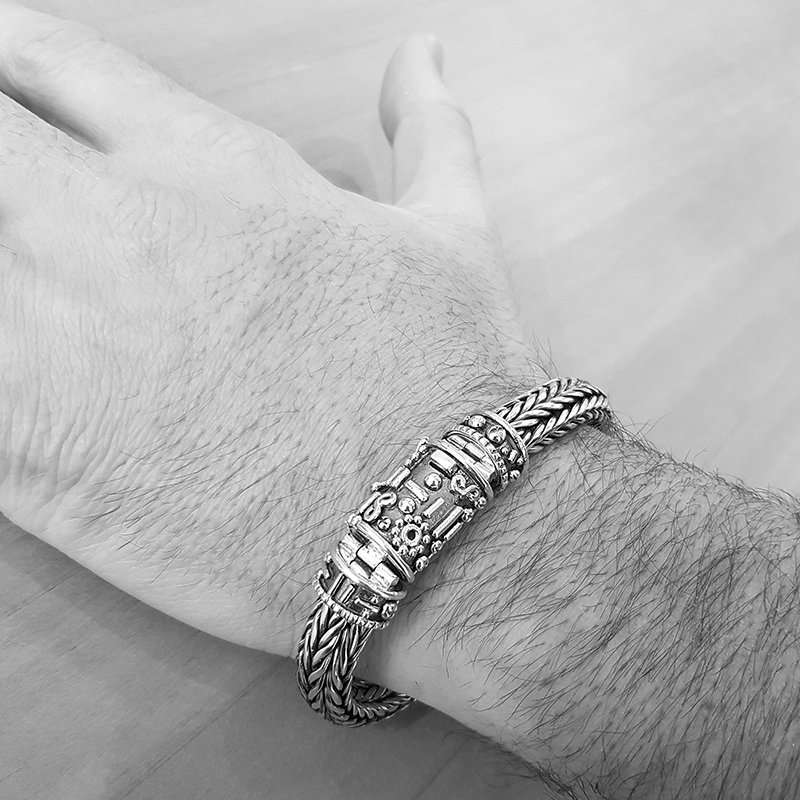 Hanweaved Silver Toba Bracelet. Made with a 10mm width chain this piece has a unique closure inspired in Batak Toba Tribes motifs.
