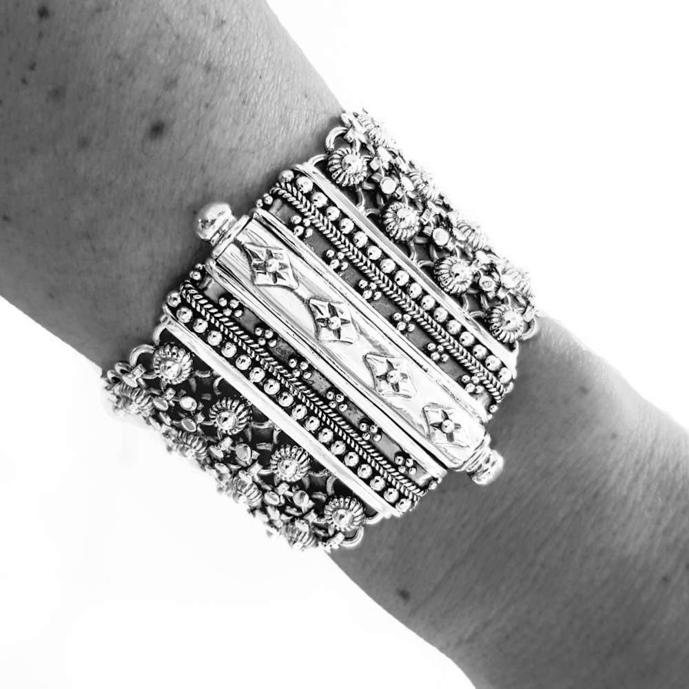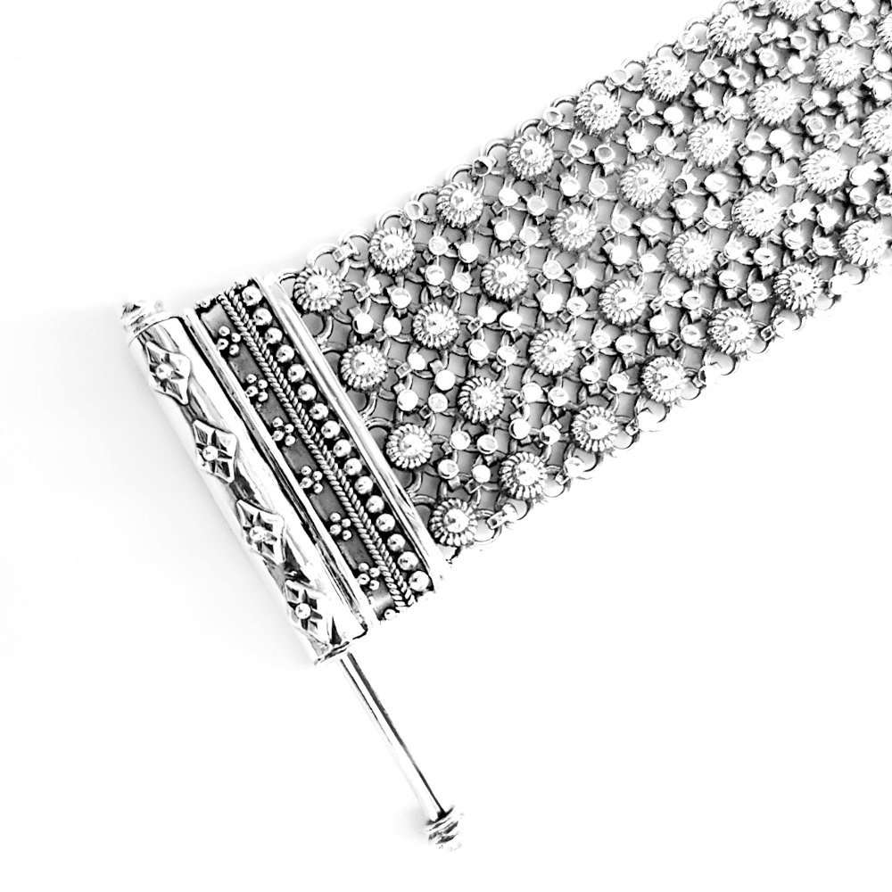 Unique closure decorated with Indian motifs. Bracelet handmade in silver from individual units welded together creating a mesh full of movement ans super comfortable.