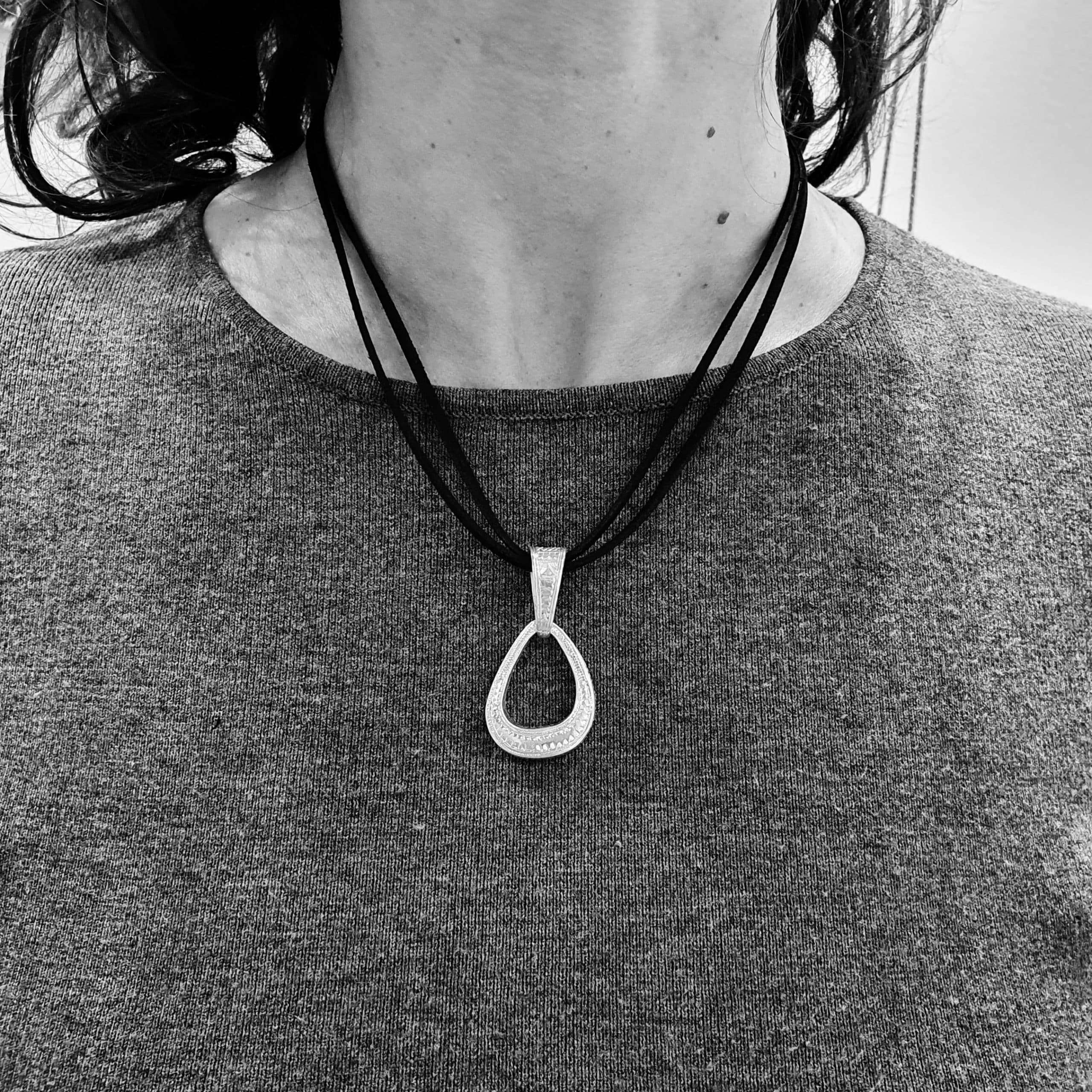 Delicate and with irregular shape handcrafted pendant. This piece is engraved on both sides, is very versatile and suitable for every day use. Made in pure silver by Tuareg smiths.