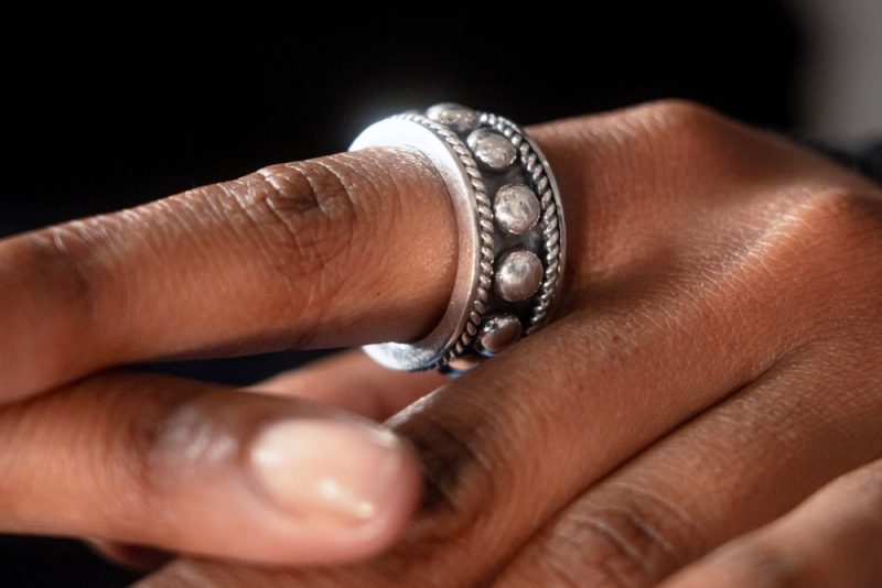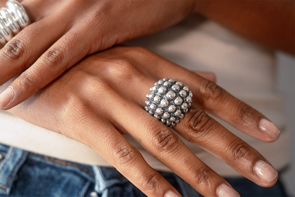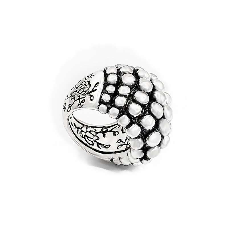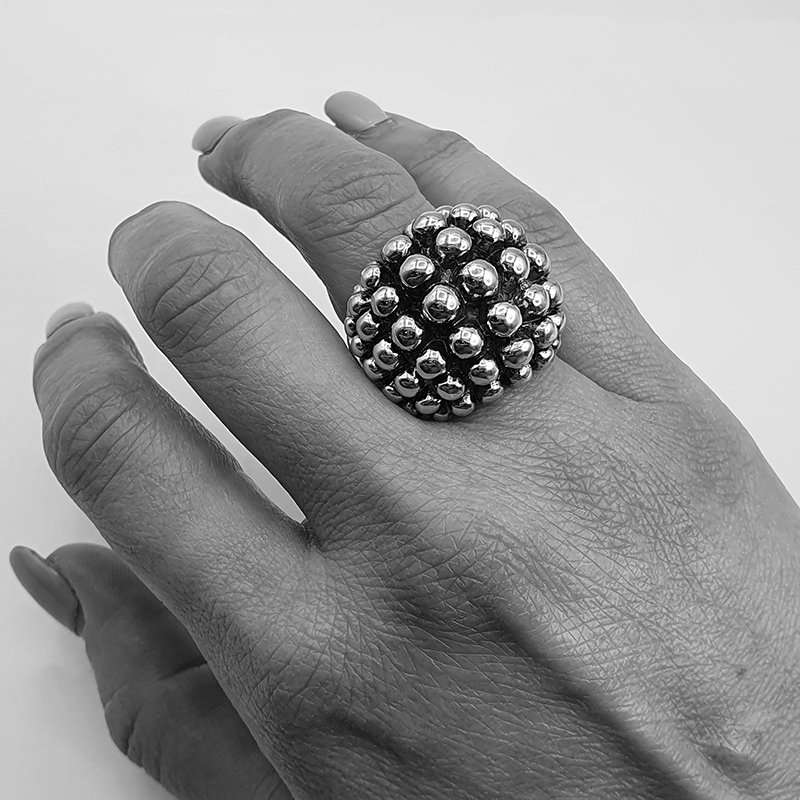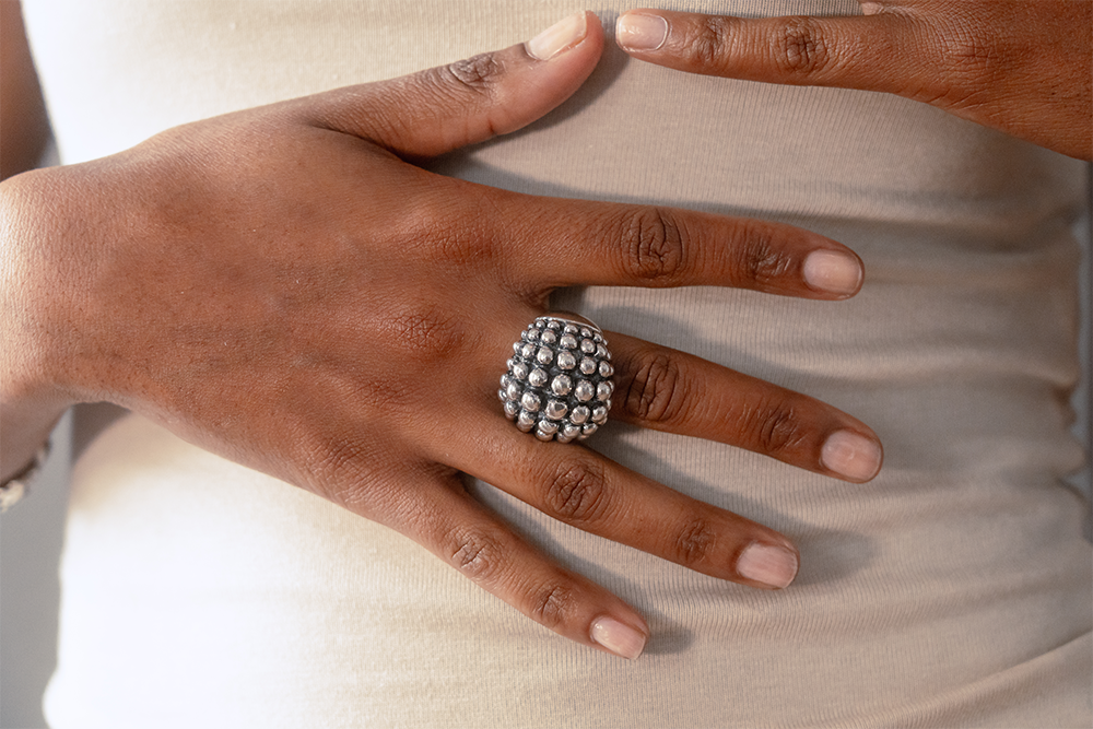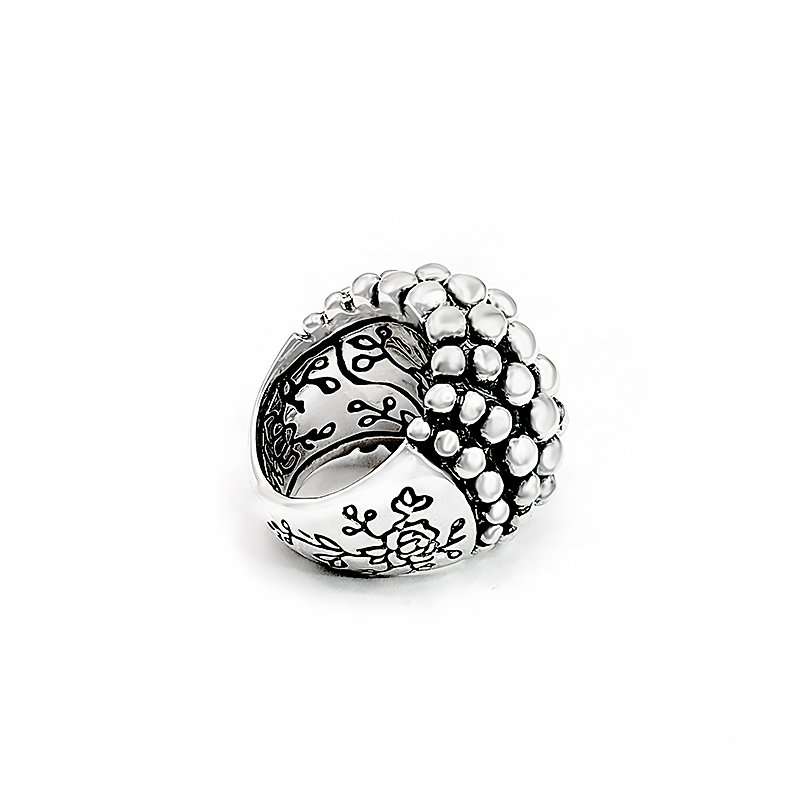 The Jawan Bunga Silver Ring is made in silver. It is decorated with big balls on top and engraved with delicate peonies motif. It is heavy yet comfortable. Therefore, a piece that never goes unnoticed. The inside of the ring is worth to be checked!