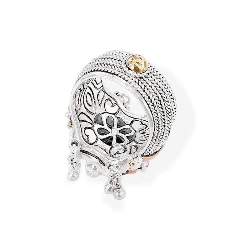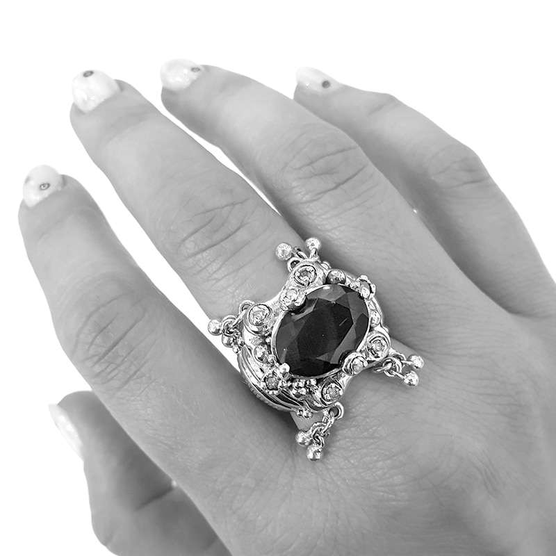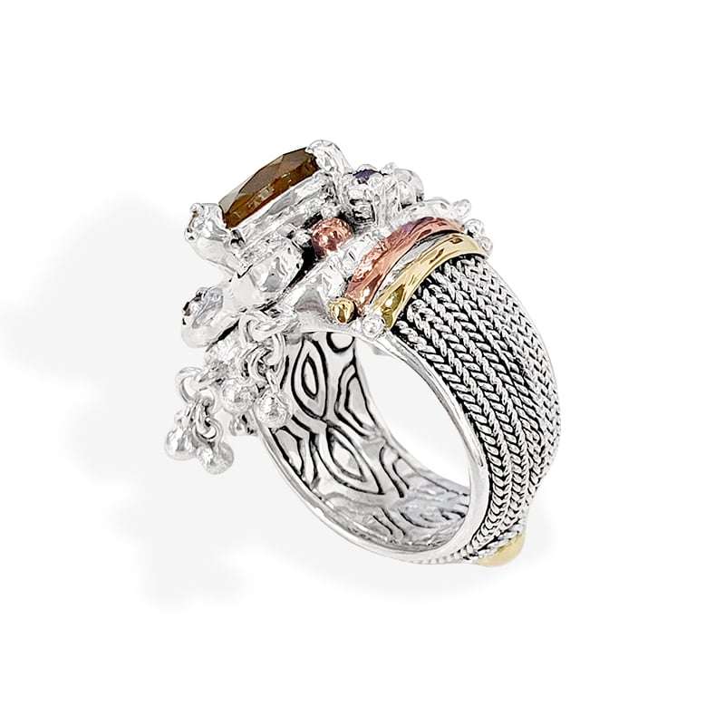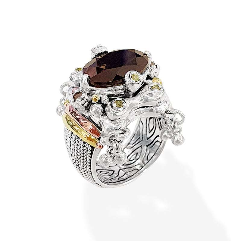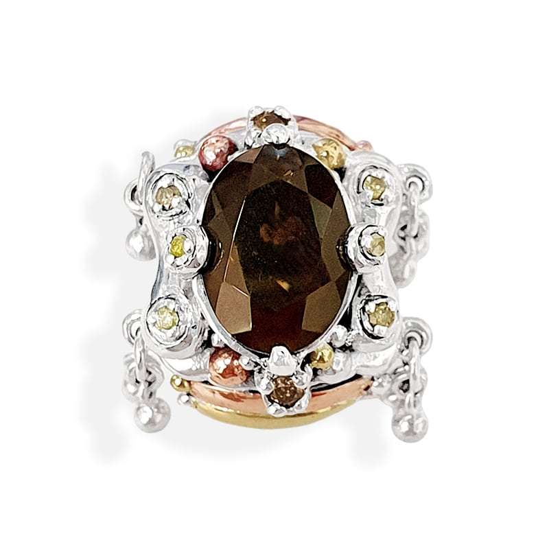 Handcrafted silver with gold details ring. Central oval smoky quartz and little rough diamonds on the sides. Dangling beads.