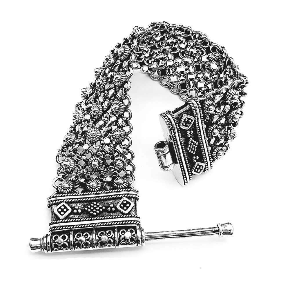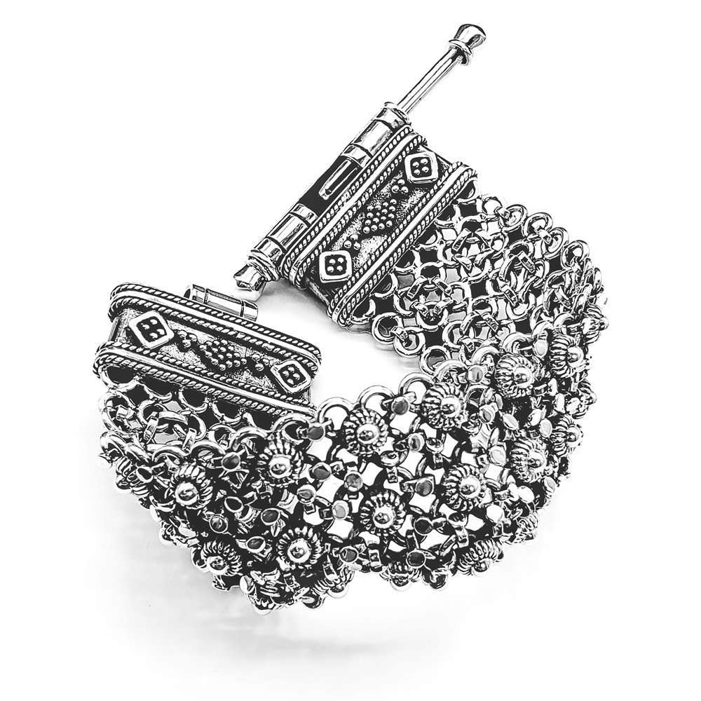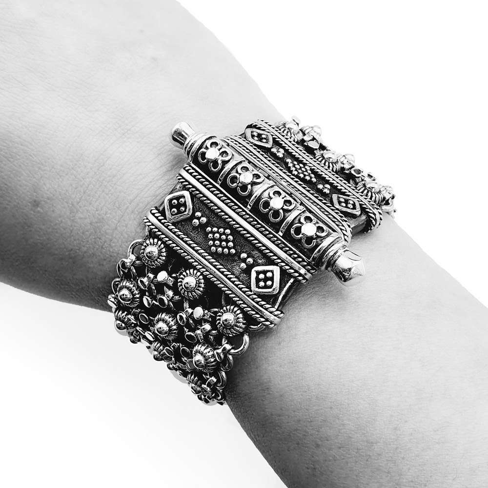 Handmade silver bracelet with high quality craftsmanship. The diversity of adornments in India is unlevelled. Throughout its 5000 years of jewellery history, pieces have been as distinct as the ethnics inhabiting the subcontinent. From dynastic kingdoms to indigenous tribal people, from tropical climate to wide mountain ranges covered in ice and snow, we find beautiful adornments as simple as flowers, seeds or shells, carefully elaborated henna decorations, along with most beautiful pieces of gold and silver, richly decorated with marvellous gemstones. There is jewellery for all parts of the body. Even the most intricate pieces are carefully handmade. Enamelled armbands from Rajasthan, gold hoop earrings and cast silver anklets are only a few examples of the wonders we encounter. Jewellery in India up until today indicates status and wealth. Additionally, symbols and shapes have always had a deep connection with religion. Art and handicraft are skills used to serve the gods. People have spent an incredible amount of time and energy to embellish the body, and through it, the human soul. Often, a single piece requires the collaboration of a designer, a silversmith or a goldsmith, a stone setter, an engravist, a lapidary, and a polisher.