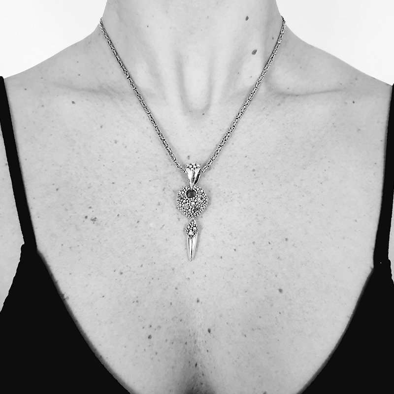 Lombok Mini Pendant handmade in silver with sapphires and Diamonds. The total length is 46 mm