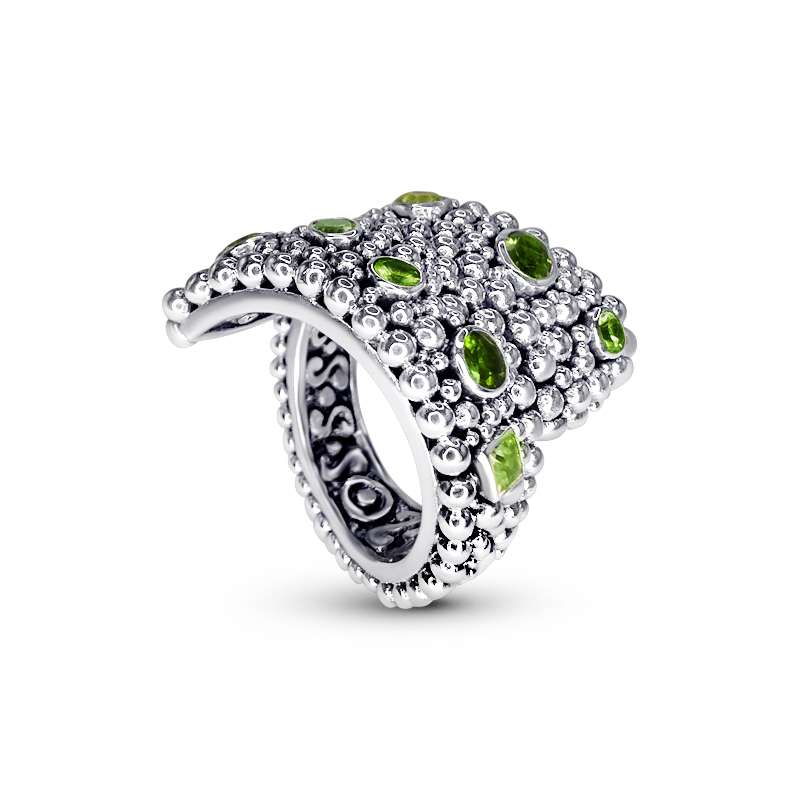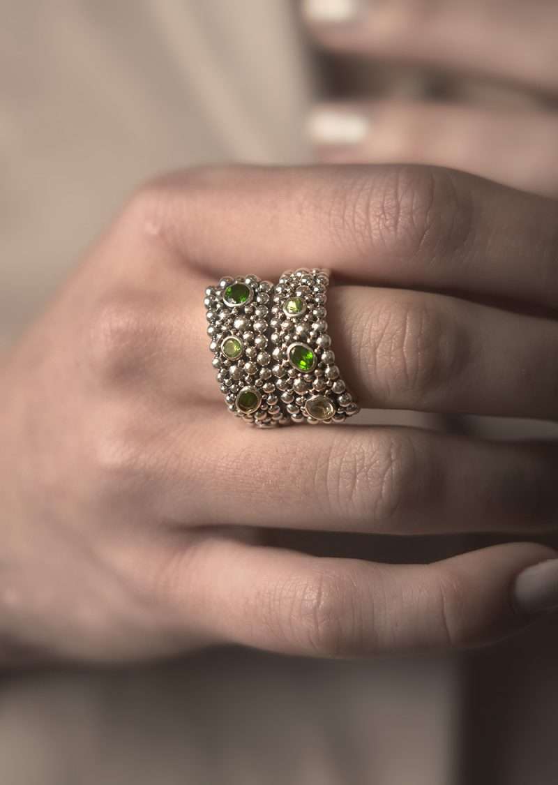 This ring is handcrafted in sterling silver, inspired by the ritualistic children’s bracelet from Bali, a classic piece of traditional Balinese jewellery. Adorned with natural Amethysts. This is the large model in a collection of three exquisite pieces. Explore the small and medium models.