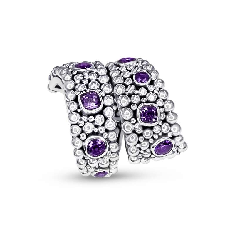 This ring is handcrafted in sterling silver, inspired by the ritualistic children’s bracelet from Bali, a classic piece of traditional Balinese jewellery. The design features a wide band that crosses elegantly at the top, creating an open and bold structure adorned with Amethyst gemstones, known for their rich purple hues that exude elegance and timeless beauty.