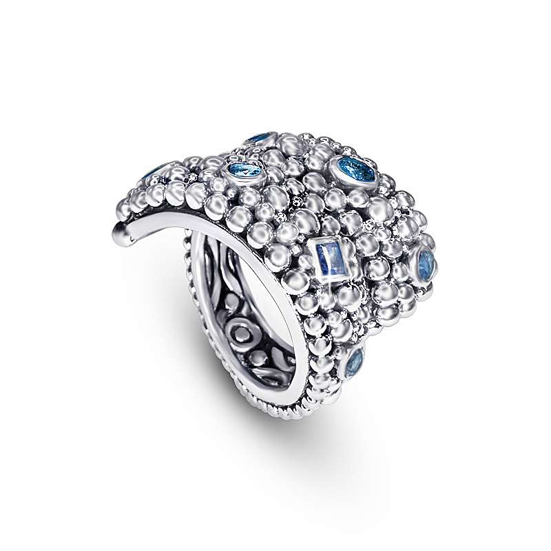 Lombok Style Handmade Granulated Silver Ring with London, Swiss, and Sky Blue Topaz – Large Model
