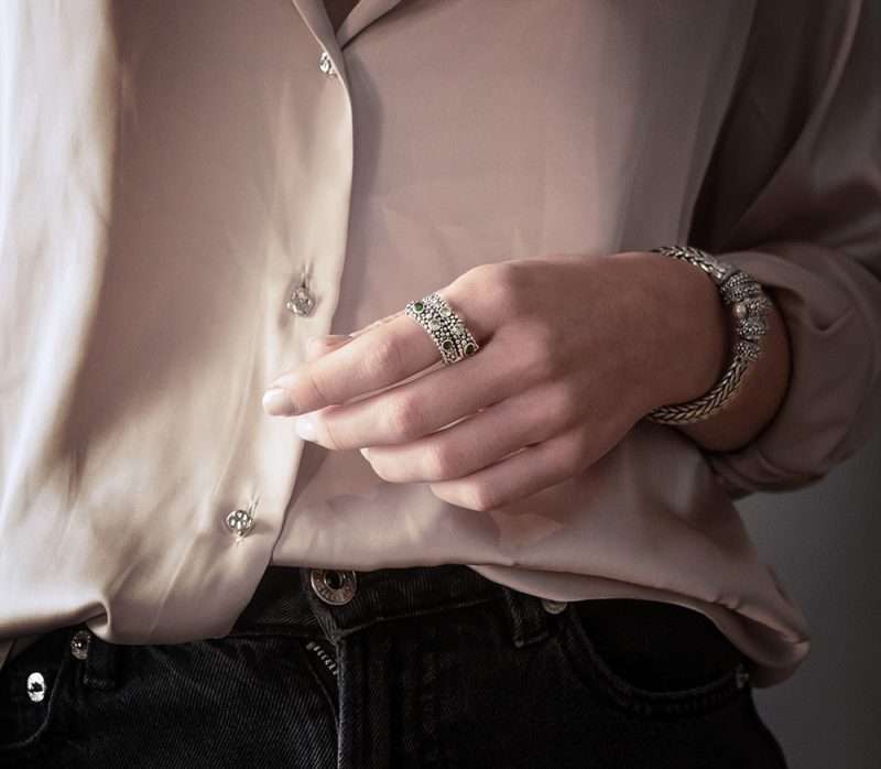 The interior of the ring is carved with a Lombok-inspired motif, adding cultural depth and artistry. Each ring is individually handmade, ensuring every piece is one of a kind.
