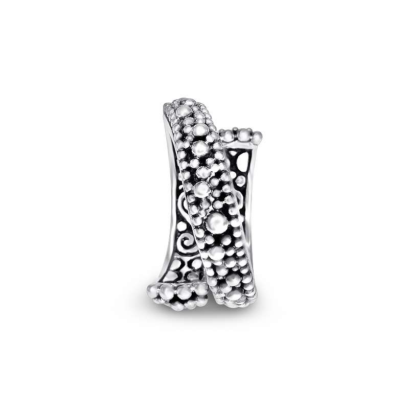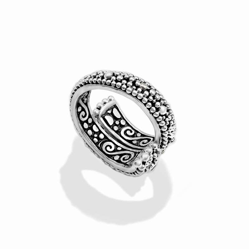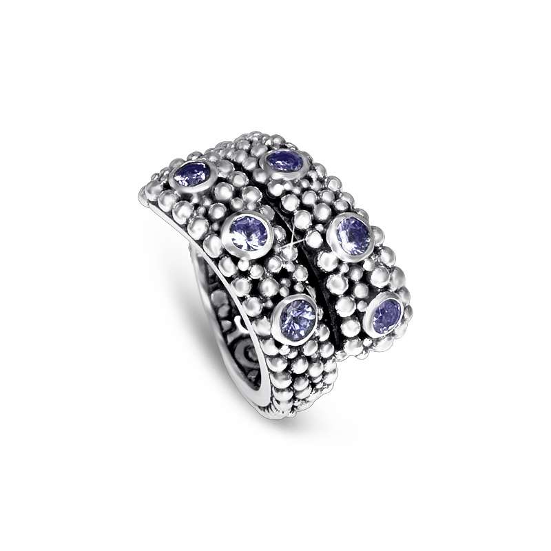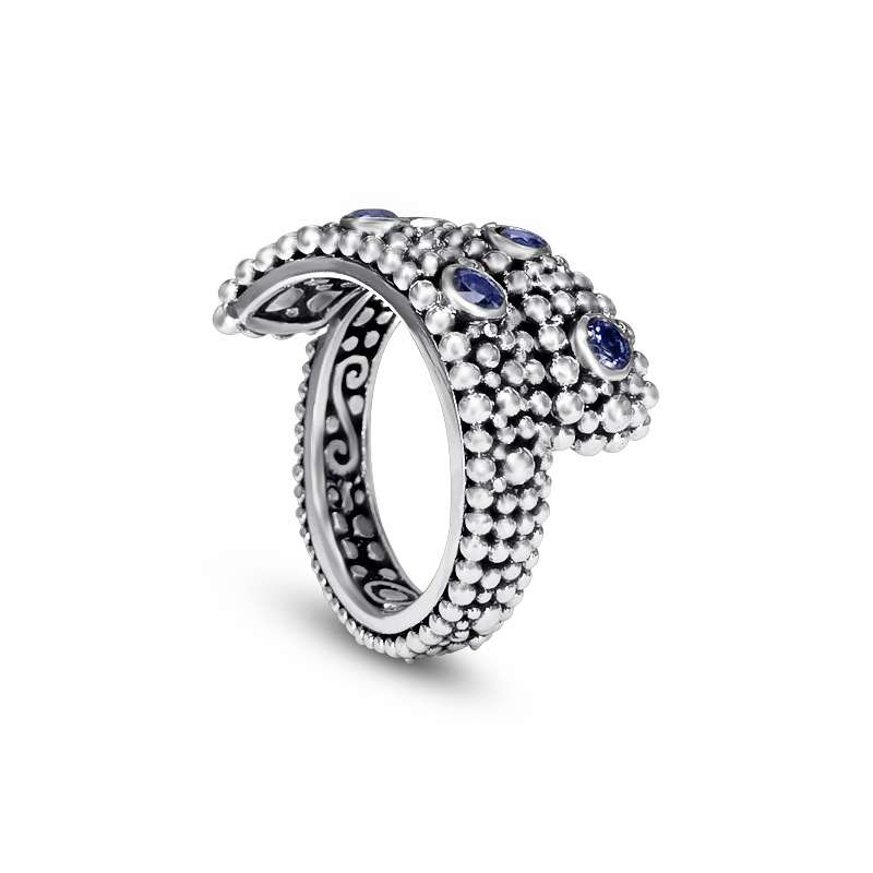 Handcrafted in sterling silver, this ring draws inspiration from ritualistic children’s bracelets from Bali, a timeless piece of traditional Indonesian jewelry. Featuring an elegant crossed-band design, it is adorned with Tanzanite gemstones, known for their captivating violet-blue hue and rarity. Hand-placed granulated silver spheres add intricate detail, while a Lombok-inspired engraving decorates the interior.