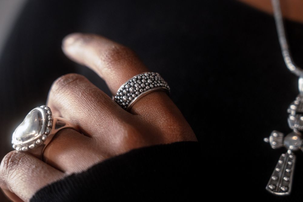 This unique ring is handcrafted in sterling silver and inspired by the ritualistic children’s bracelet from Bali. The design features intricate raised bead details across its bold 9 mm width, with each bead delicately placed by hand, one by one, showcasing exceptional attention to detail and artisanal skill.