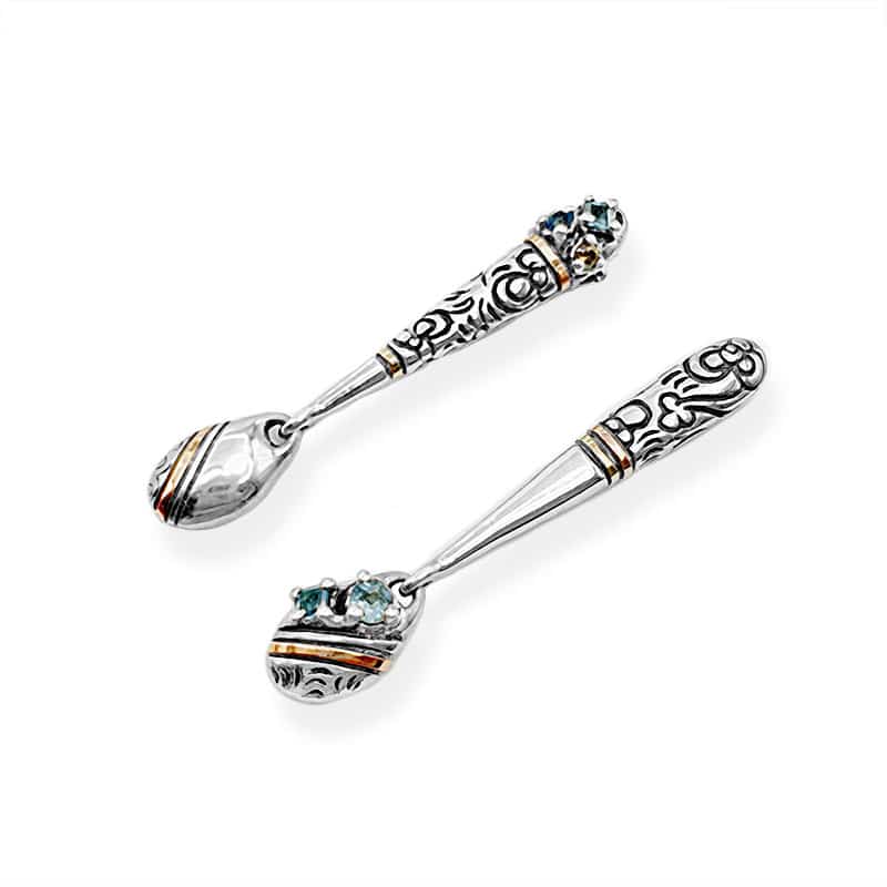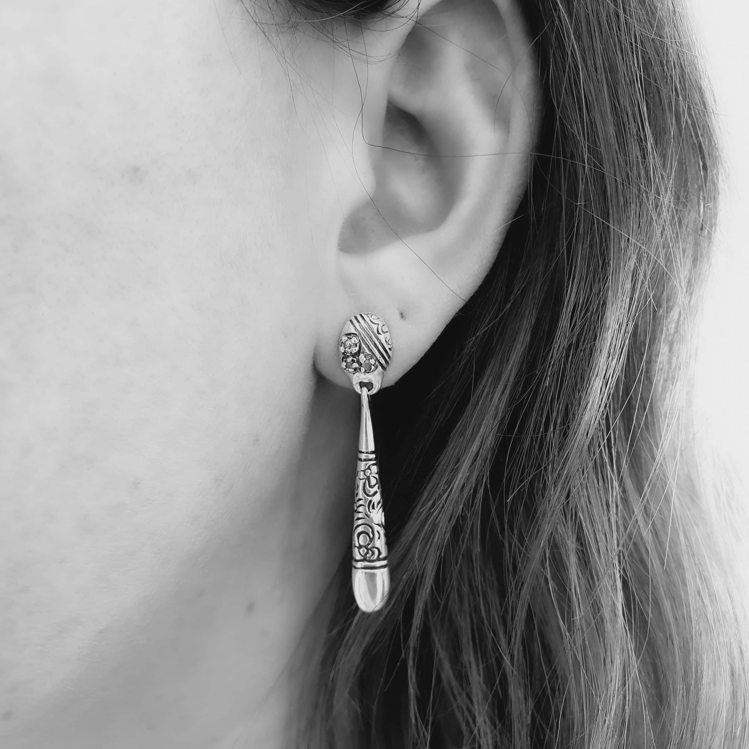 The Miao dropped earrings with blue sapphires, rough diamonds & Gold are individually handmade. If you take a close look you will discover the asymmetric position of the stones and engravings.