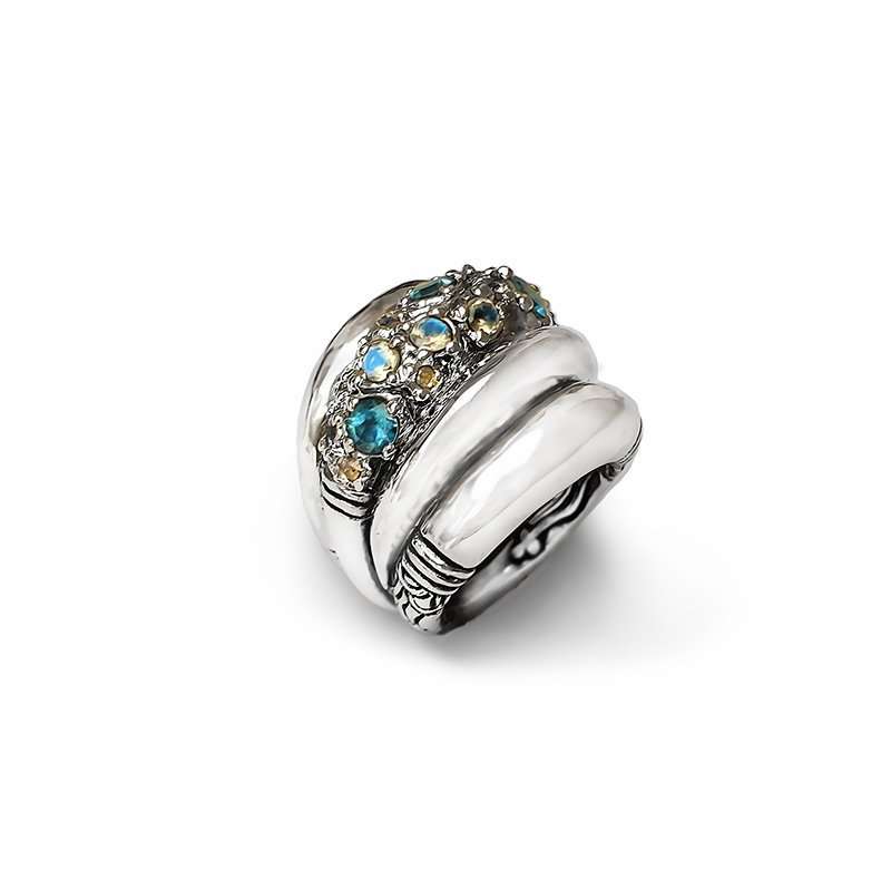 Miao Ring Blue Shades is handmade in silver and precious stones such as Tanzanites, Moon Stones, Topaces, Aquamarine and Sapphires.