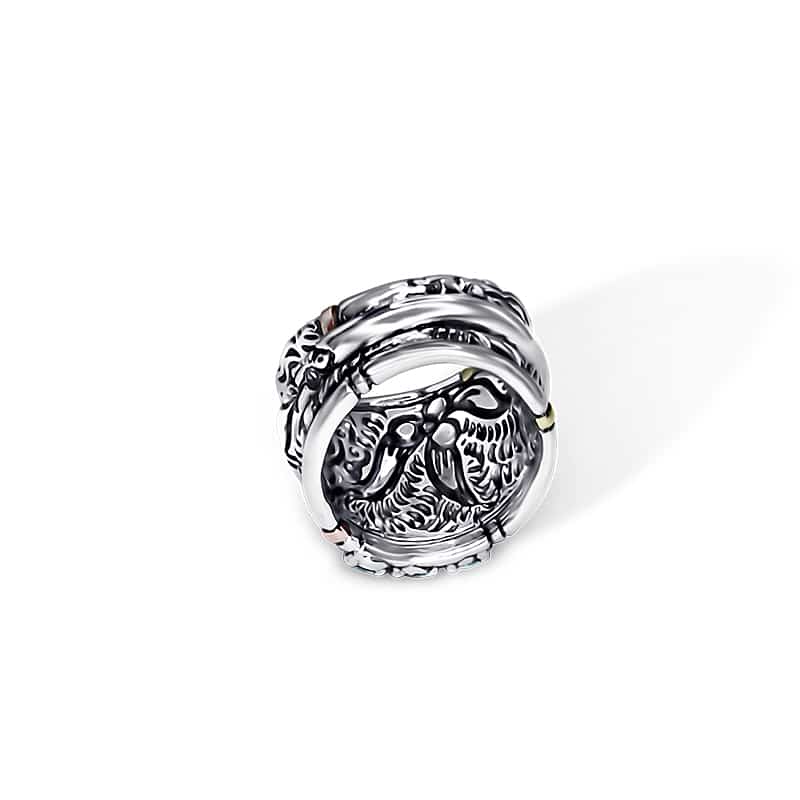 Inspired by the mountain tribes of the Golden Triangle, its layered structure mimics the look of five stacked rings, with one band in yellow gold, another adorned with pavé-set gemstones, and others featuring intricate tribal-inspired engravings. The engraved interior, inspired by Miao motifs, adds an artisanal touch.