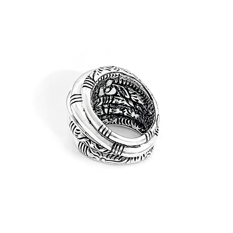 The Miao Silver Ring is part of the Multiring collection. This individually handmade ring is mostly plain on top and shows some engravings at the bottom that gives the ring that special style. The shape continues in the inside which is engraved with a delicate motif too.
