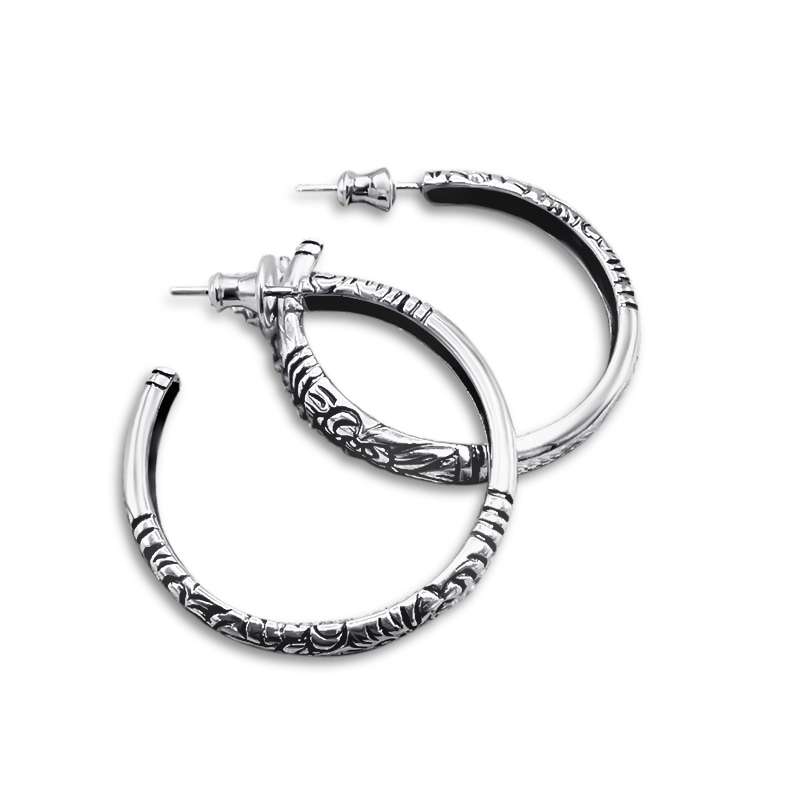 Crafted from high-quality sterling silver, the earrings showcase delicate engravings that add refined, textured details to their sleek silhouette. Handmade with a diameter of 30 mm, a width of 4 mm, and an approximate weight of 9 grams, these earrings blend traditional craftsmanship with a modern aesthetic, offering both versatility and timeless appeal.