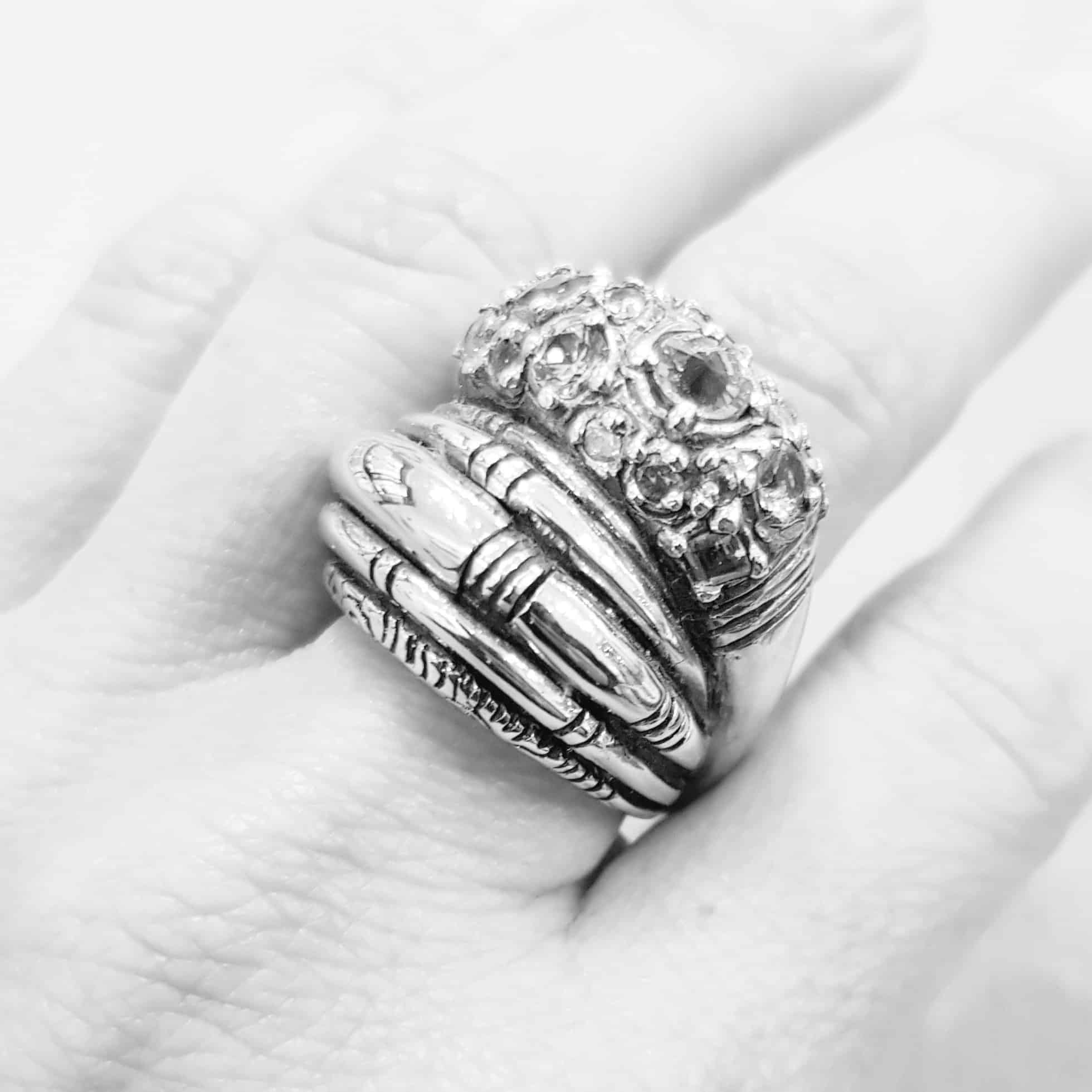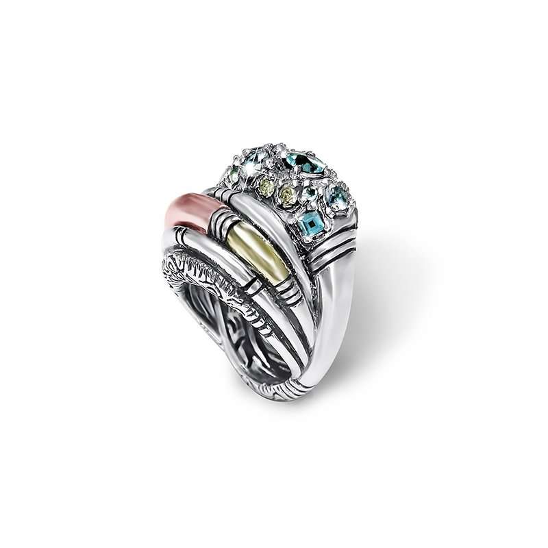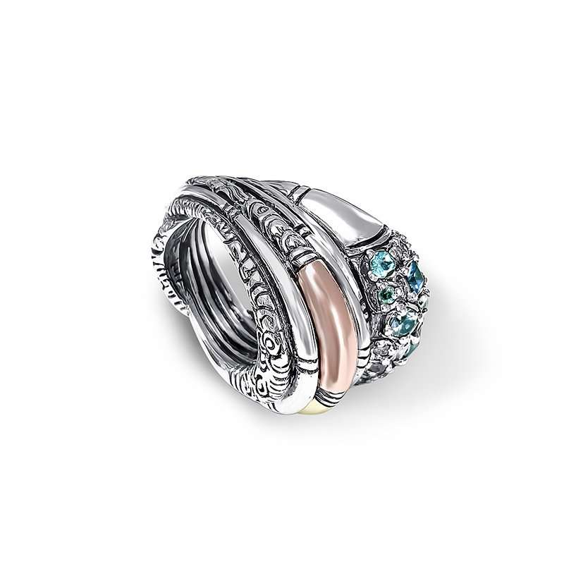 The Mountain Tribes Crossed Multiring has two (2) colours of gold, Sapphires and Rough Diamonds.