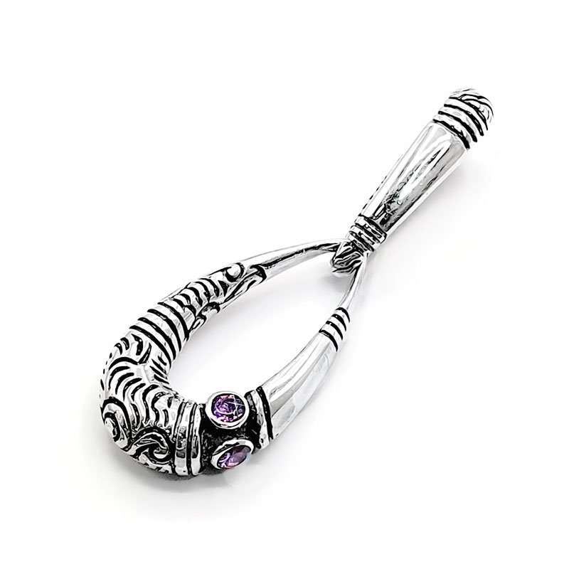 The Mountain Tribes elongated pendant was handmade in silver with amethysts. The total length is 52 mm and 15mm width