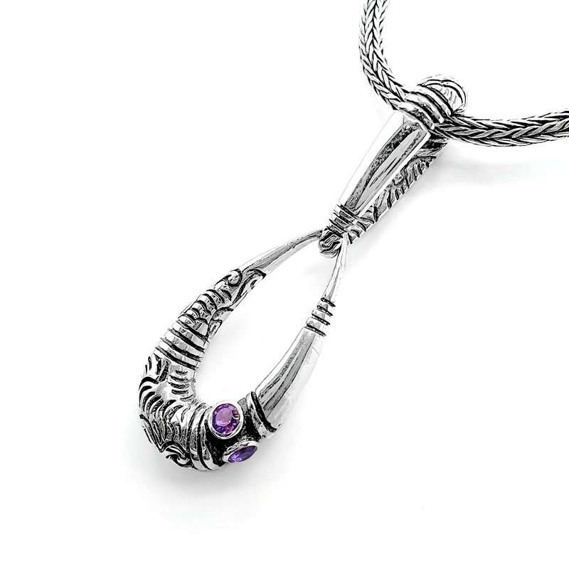 The Mountain Tribes elongated pendant was handmade in silver with amethysts.