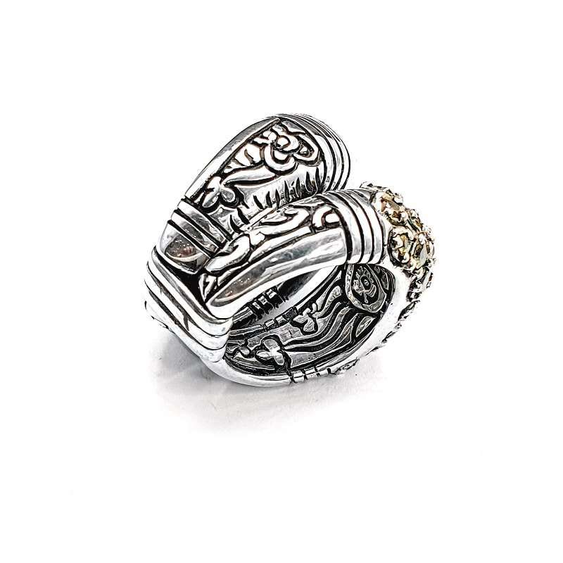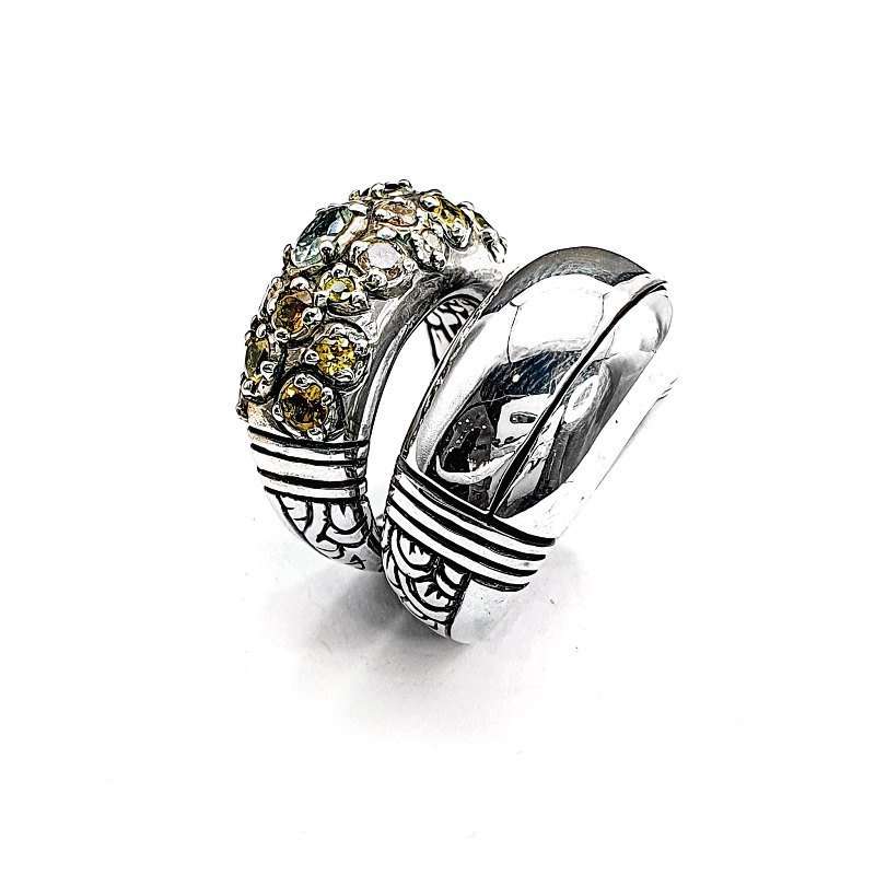 The Multiring Double Ring was handmade in silver. This piece has two rings attached at the bottom. Each of them moves but when you are wearing it looks like 1! It features sapphires and tourmalines in green, blue and yellow shades.