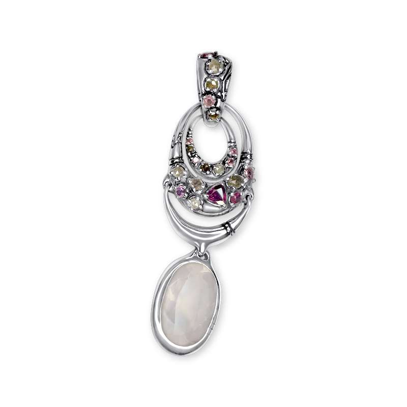 This exquisite sterling silver ring features a stunning arrangement of radiant rhodolites in captivating pink-to-red hues, creating a harmonious and vibrant design. Inspired by the mountain tribes of the Golden Triangle, its layered structure mimics five stacked rings, blending boldness with refined elegance.