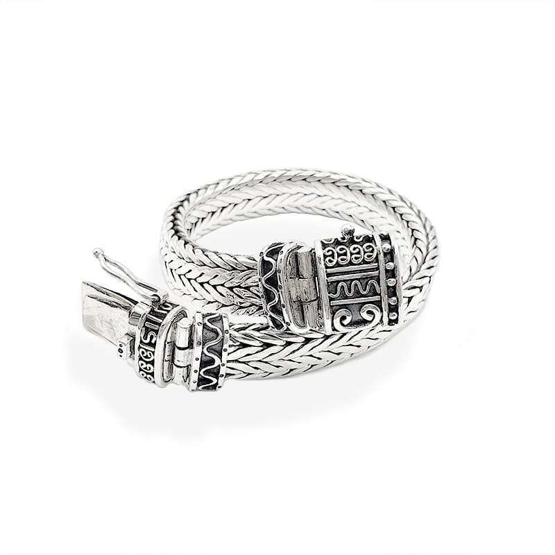 Nagaland Silver Bracelet. Made with a 10mm width chain this piece has a unique Nagaland inspiration closure. Length is 21.5 cm but can be adjusted to smaller sizes.