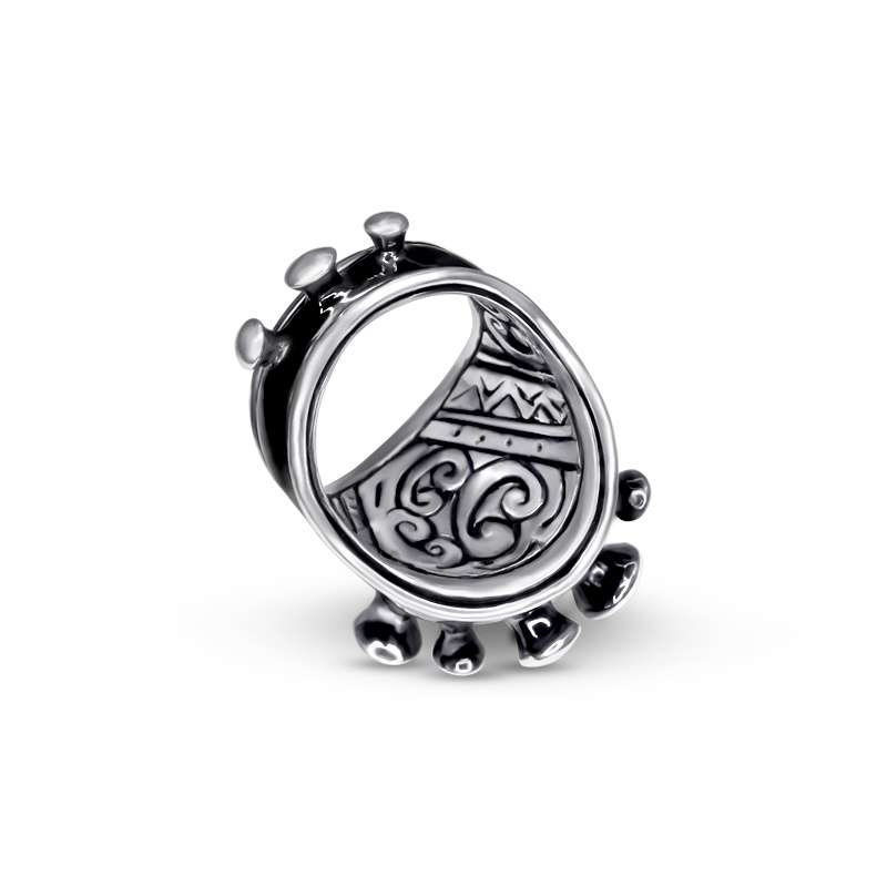 Crafted entirely by hand, this striking sterling silver ring draws inspiration from the weaponized wristlets worn by Naga warriors. It features 11 dramatic spikes of varying heights, finished with a rich oxidized tone that contrasts beautifully with polished silver highlights. The inside of the band is engraved with authentic Nagaland motifs—symbols that pay tribute to traditional tribal craftsmanship and warrior insignias.