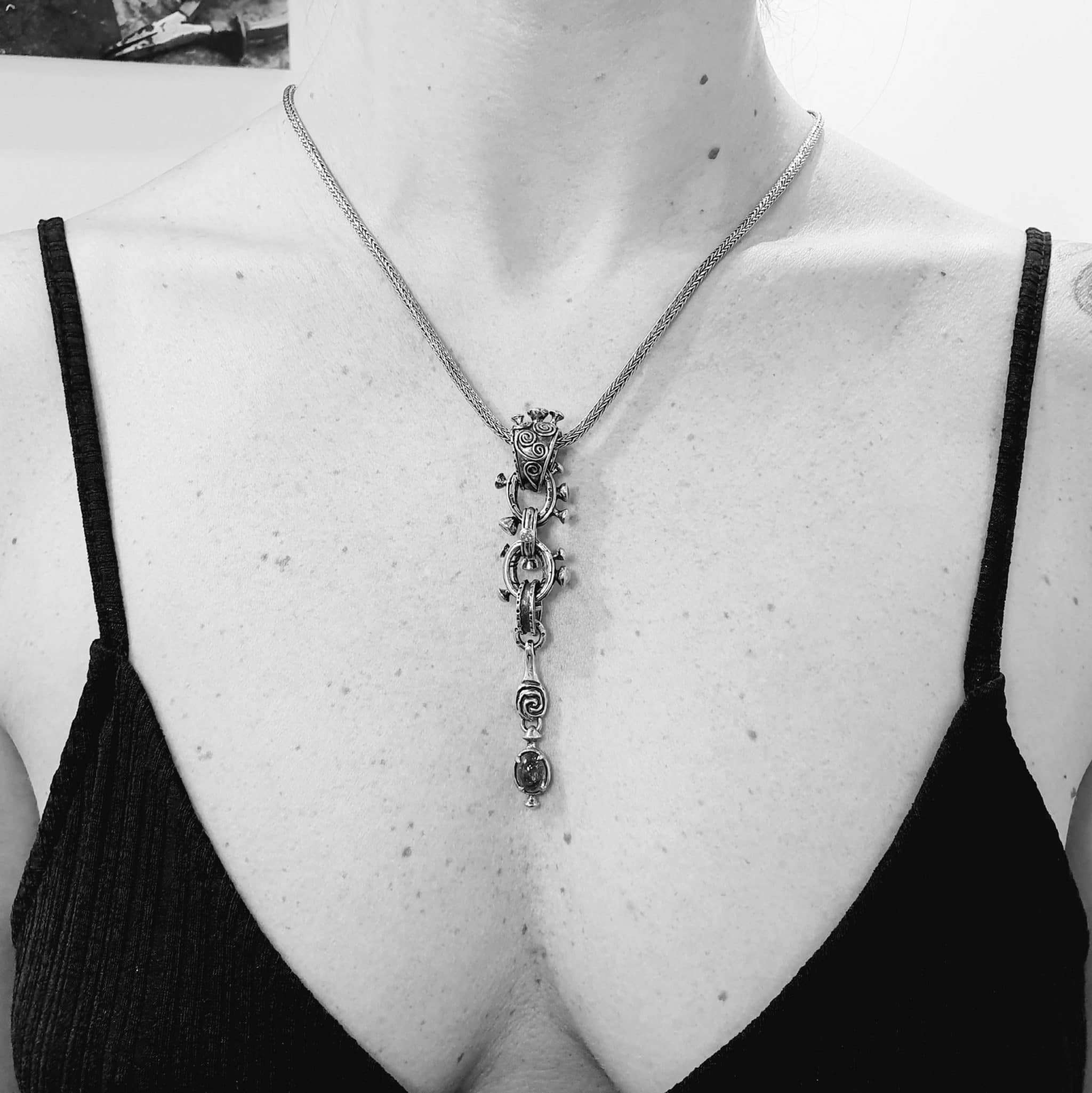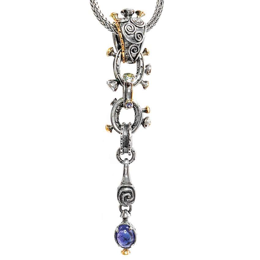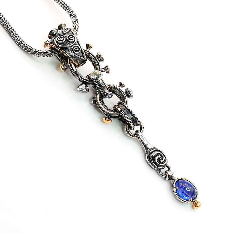 One of a kind handmade pendant inspired in Naga Tribes war adornments. Ending with a Tanzanite cabujon and decorated with gold wires and smaller diamonds and sapphires. Total length is 77mm and 21 mm width.