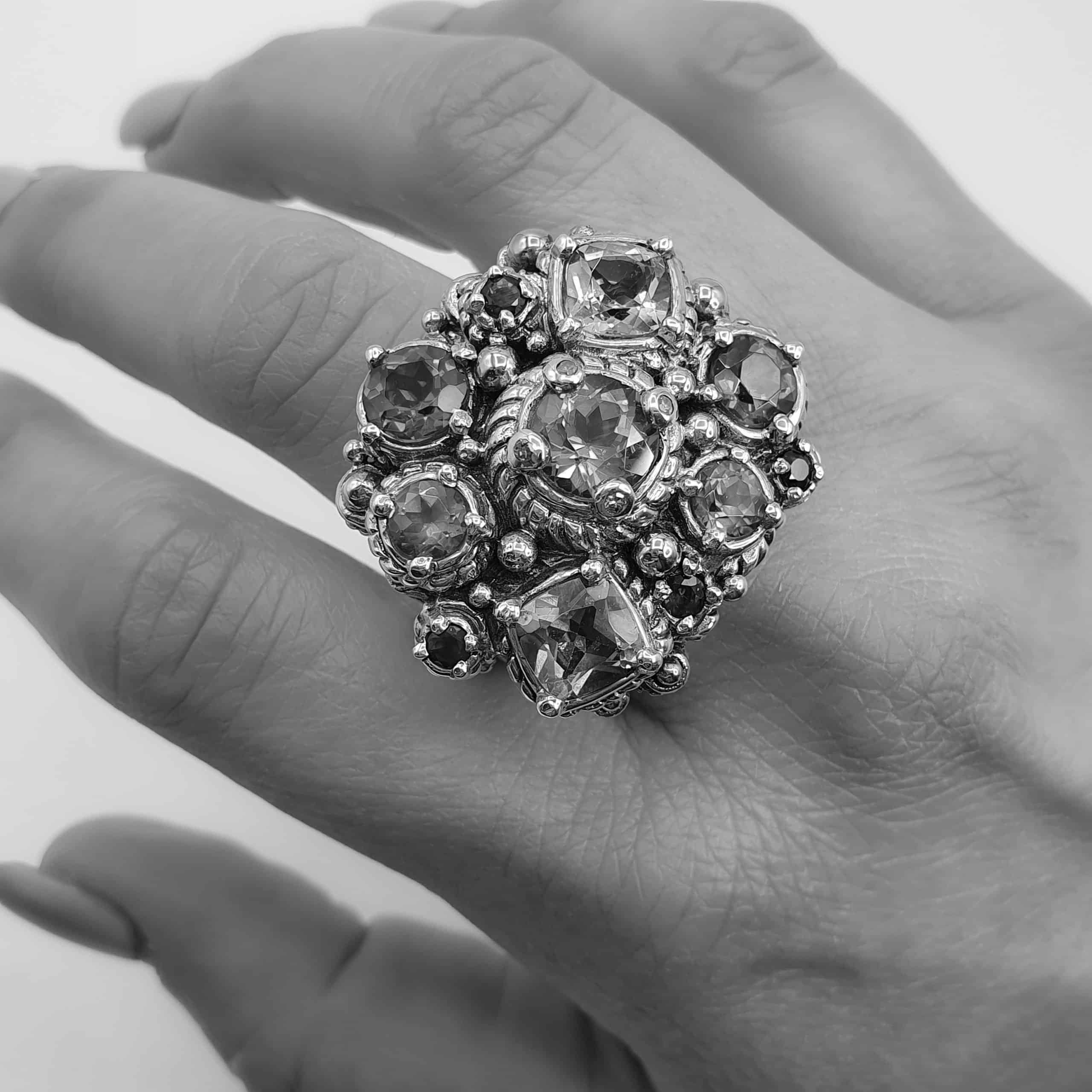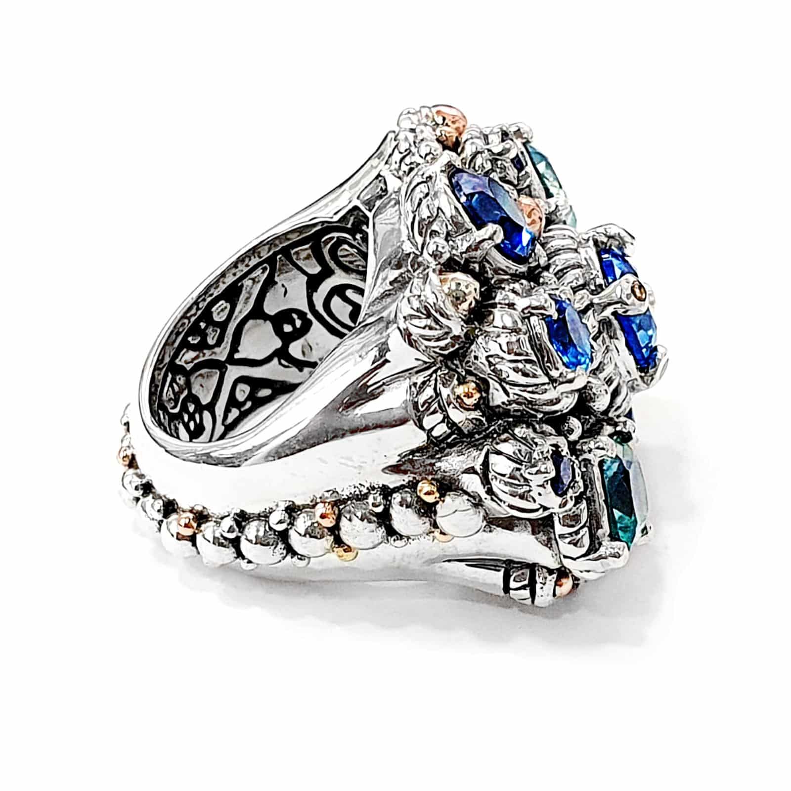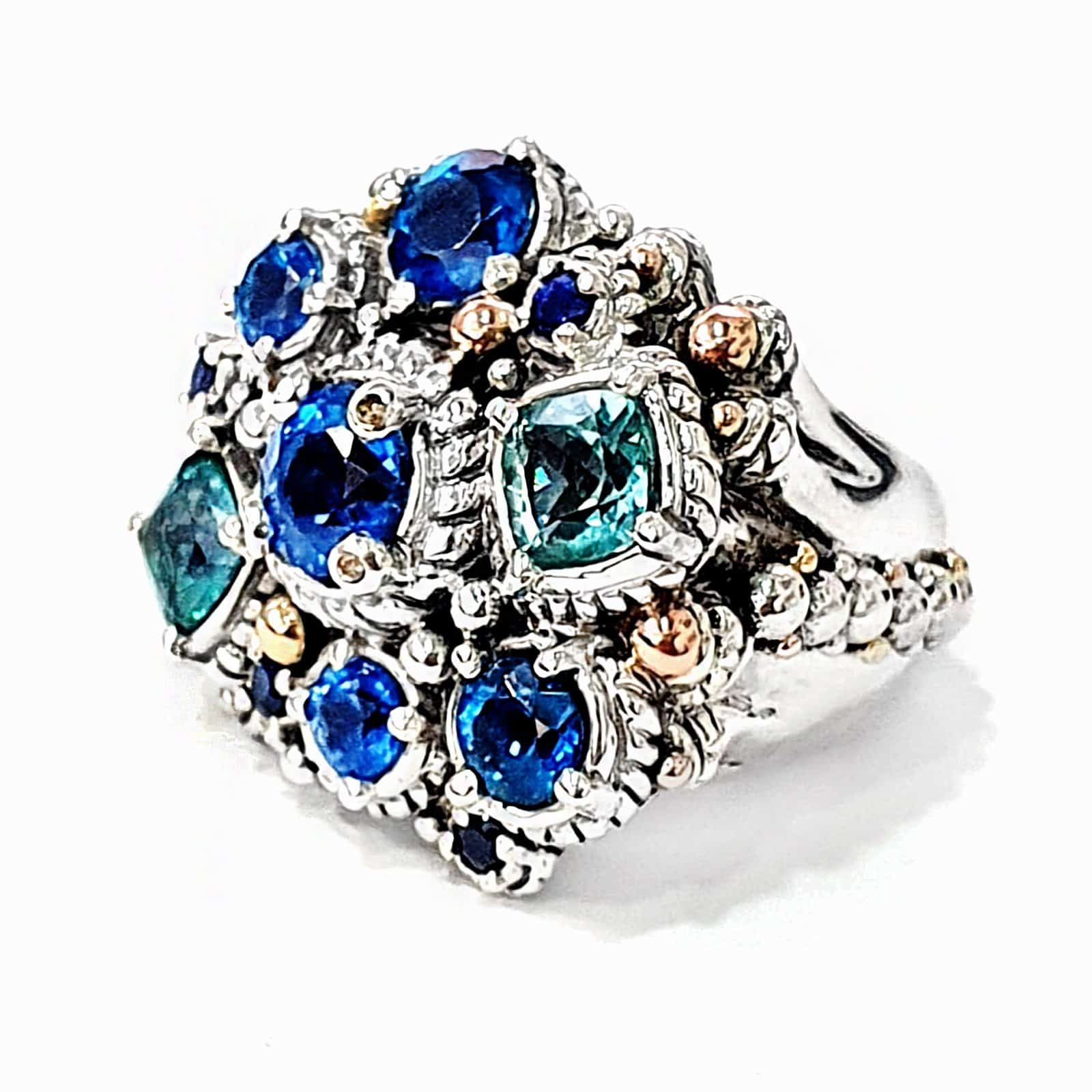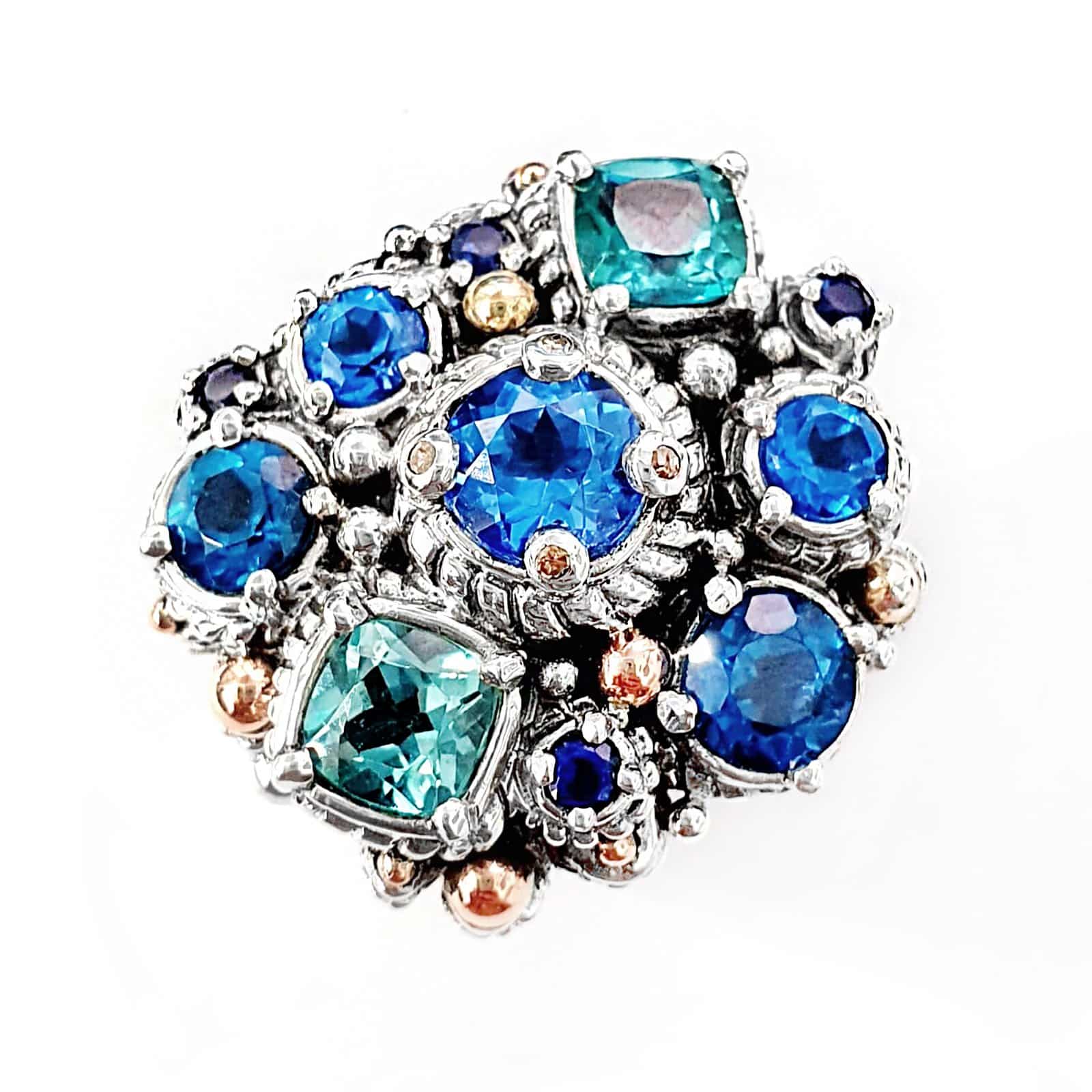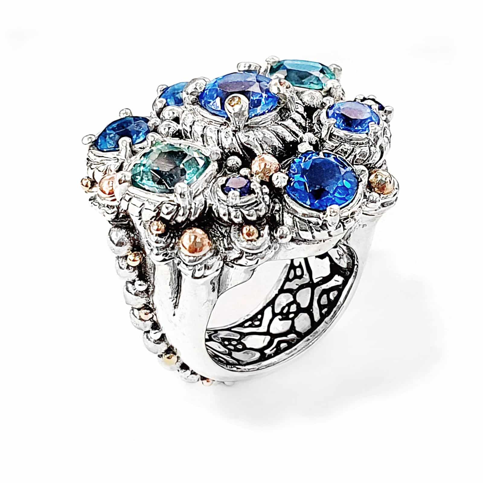Nava Ratna Ring in Blue shades. Made in silver with Gold decorations and Topaces in various blue shades and Diamonds