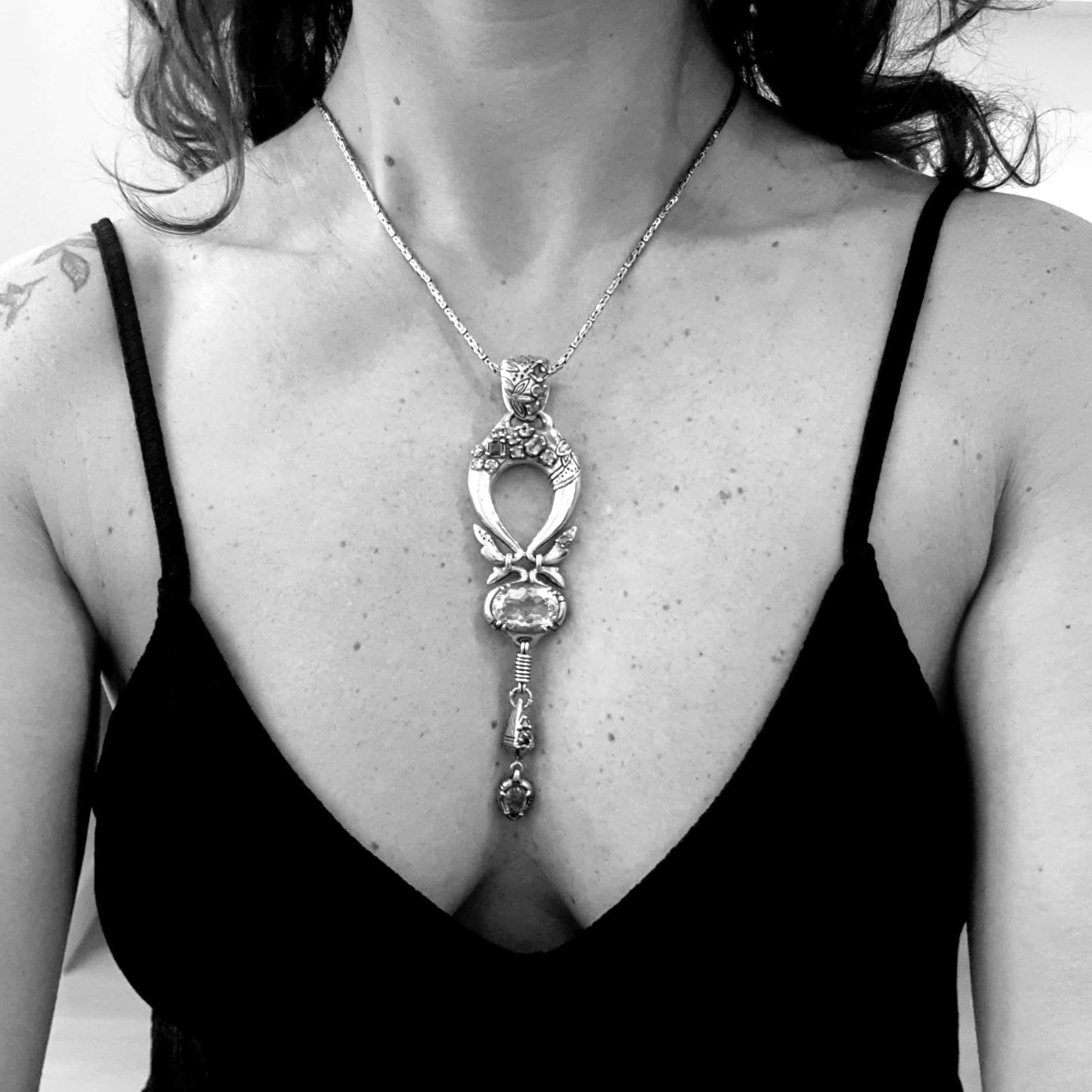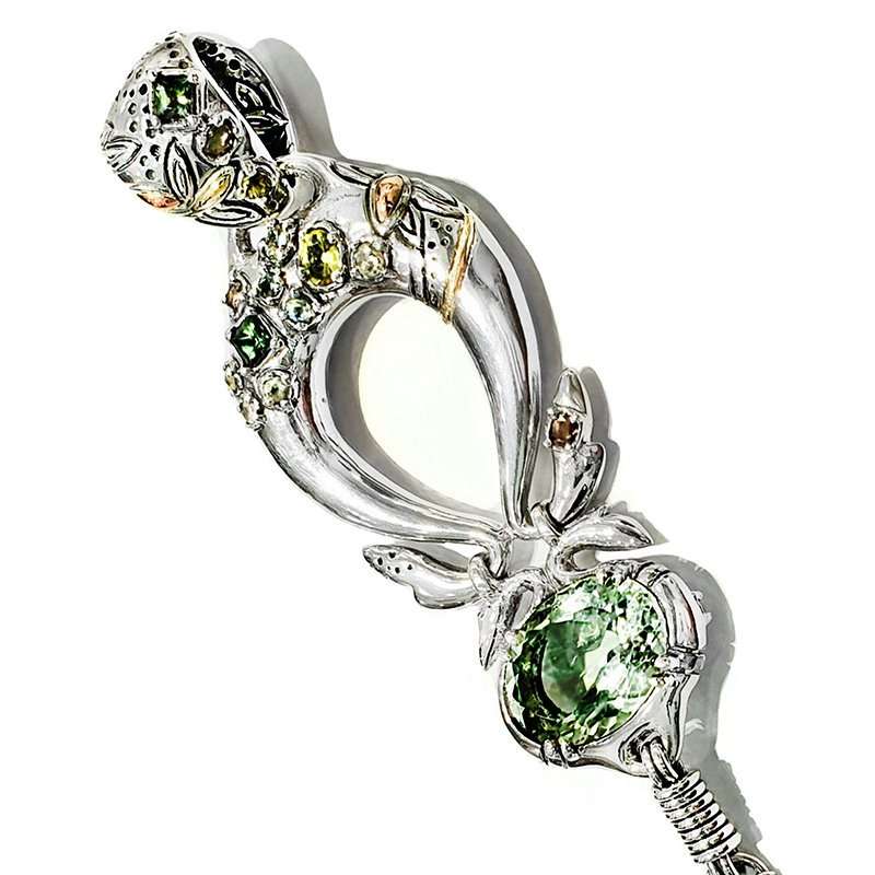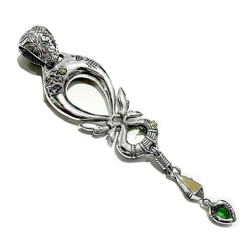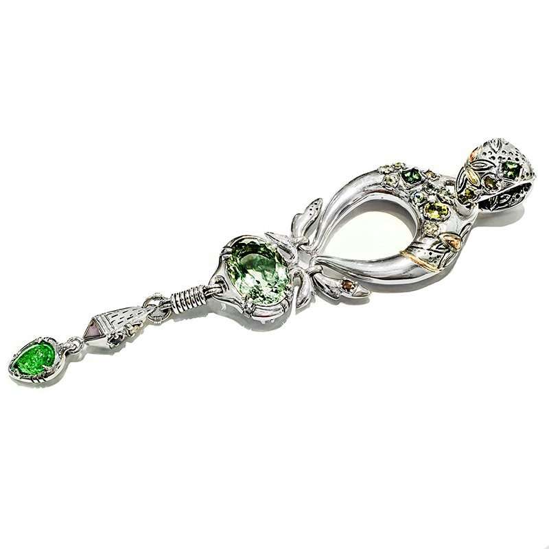 One of a kind green quartz pendant. Handmade in silver with Gold, Diamonds Saphires an Oval Green Quartz and a dropped cabujon tsavorite that spins ath the bottom.