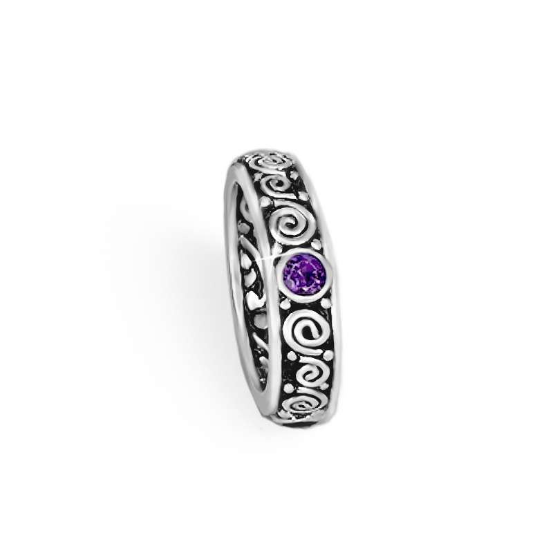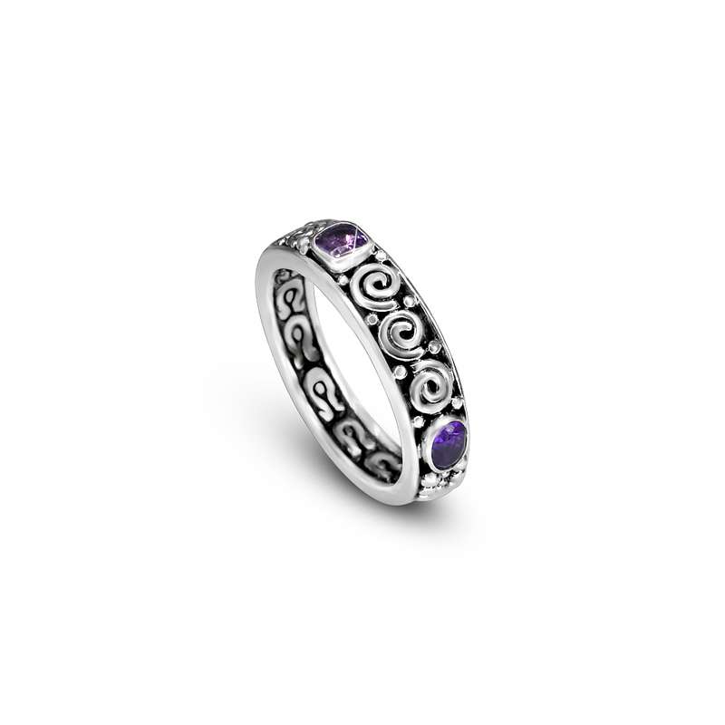 The Orito Ring is a true testament to craftsmanship and tradition. Handcrafted in sterling silver, its exterior features a blend of delicate filaments, swirling motifs, and spheres, forming a unique pattern that reflects the skill of our silversmiths and the heritage of Indonesian jewelry. Amethyst gemstones are set into the band, adding a touch of deep purple elegance.
