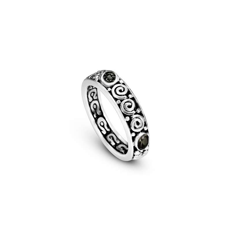 The Orito Ring is a true testament to craftsmanship and tradition. Handcrafted in sterling silver, its exterior features a blend of delicate filaments, swirling motifs, and spheres, forming a unique pattern that reflects the skill of our silversmiths and the heritage of Indonesian jewelry. Black Onyx gemstones are set into the band, adding a bold, timeless elegance.