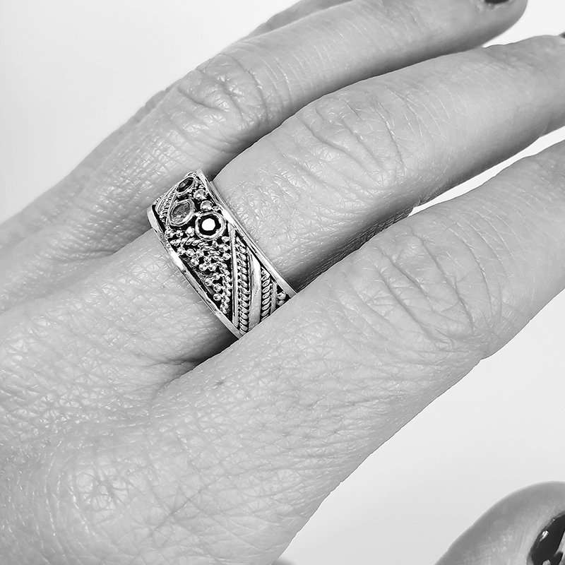 The Orito Ring is Made in silver with sapphires. The motif is completely unique for this piece since every detail, ball and wire is applied by hand. 9mm width.
