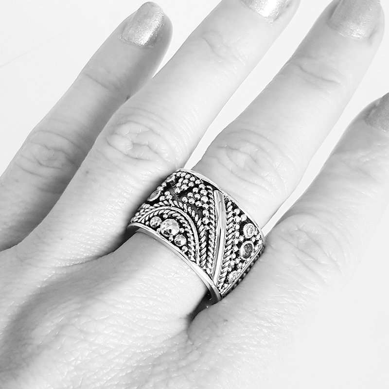 The orito silver ring has sapphires. The motif is completely unique for this piece since every detail, ball and wire is applied by hand. 15mm width.