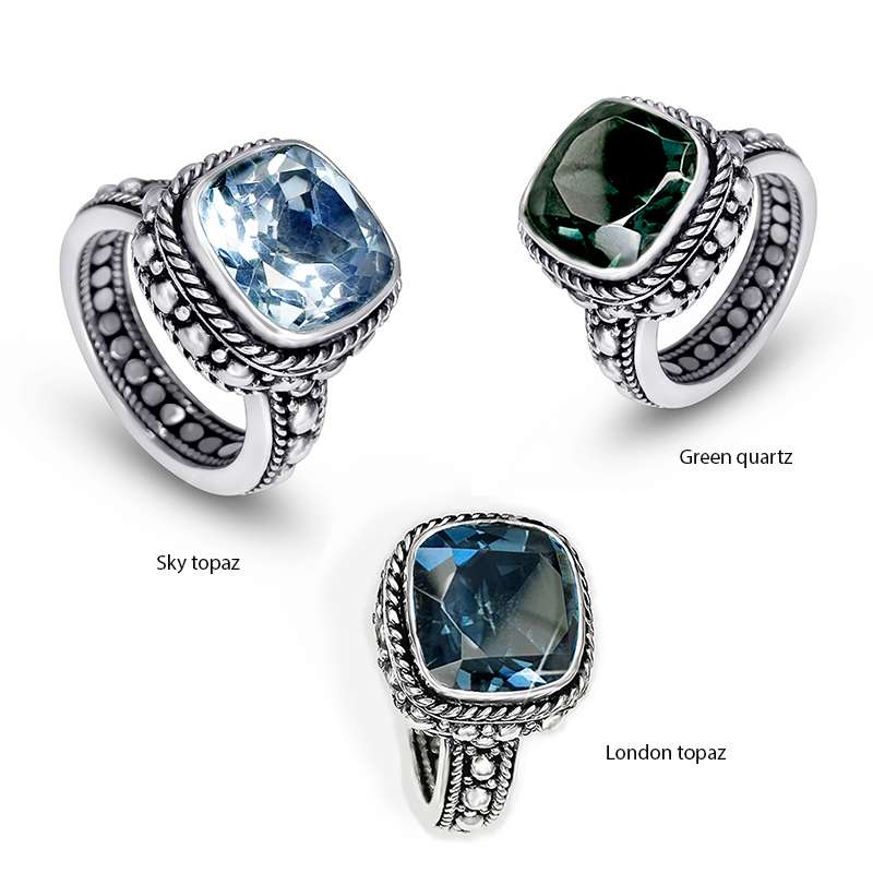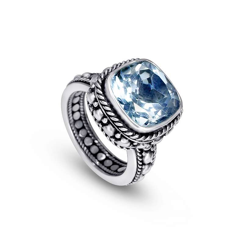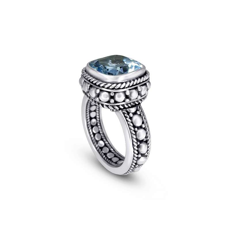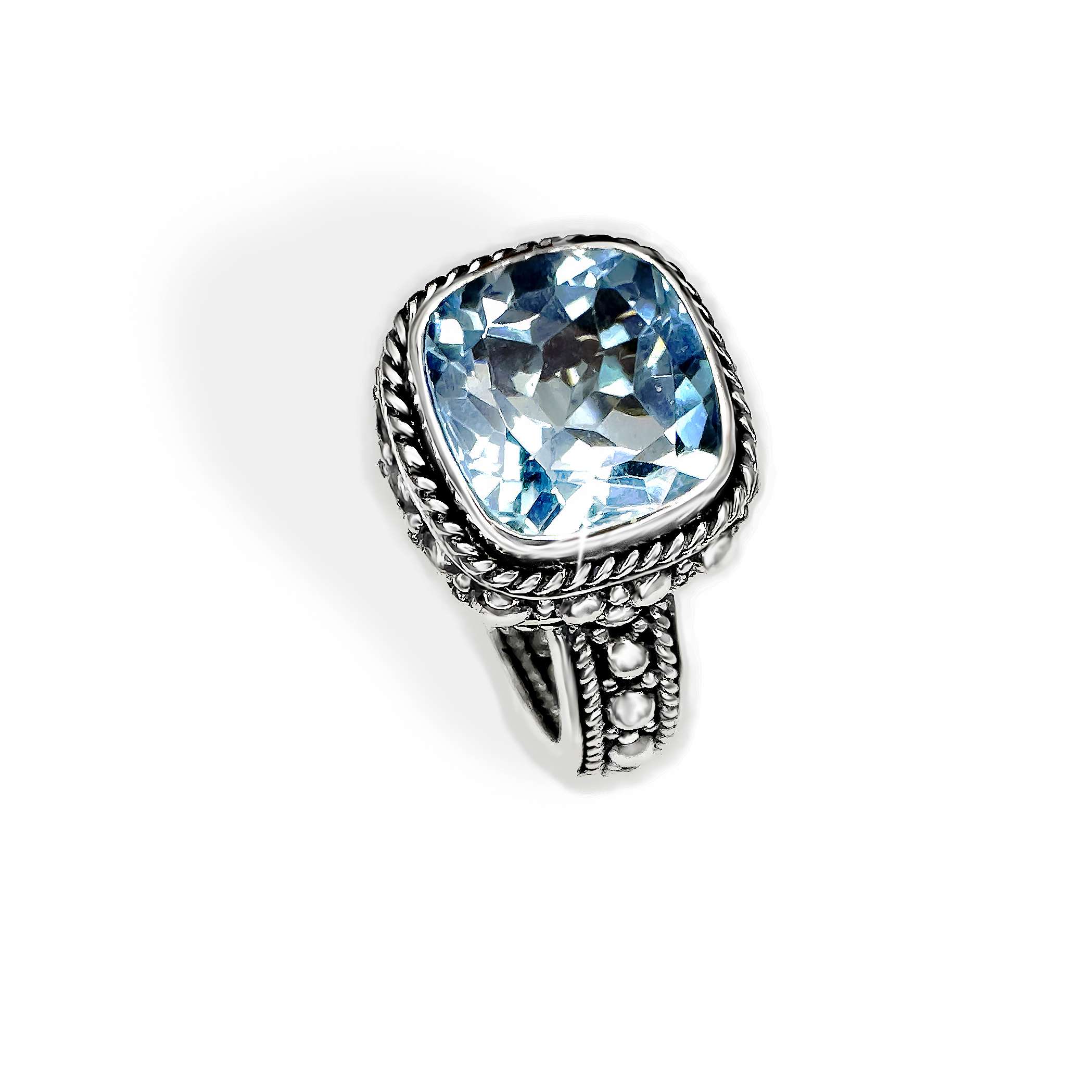 Elegant sterling silver ring featuring a stunning cushion-cut gemstone in Sky Blue Topaz, London Topaz, or Green Hydro Quartz. Intricate beadwork and rope detailing enhance its timeless design, inspired by Austronesian craftsmanship. Available in various gemstone options and alternative stone shapes to suit your style.