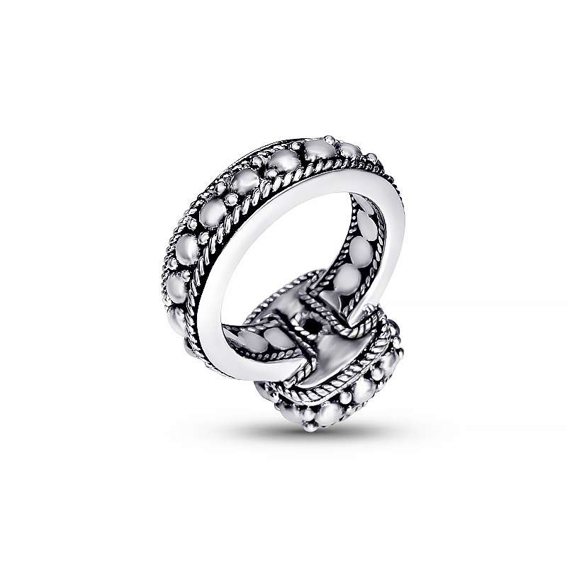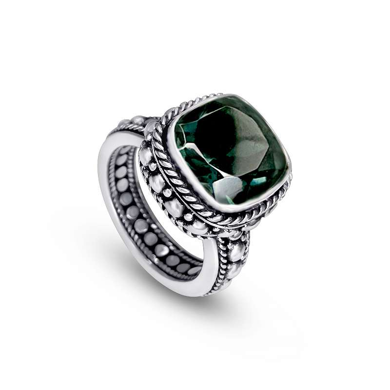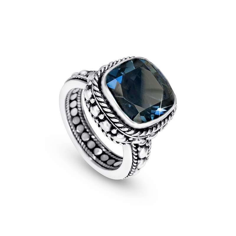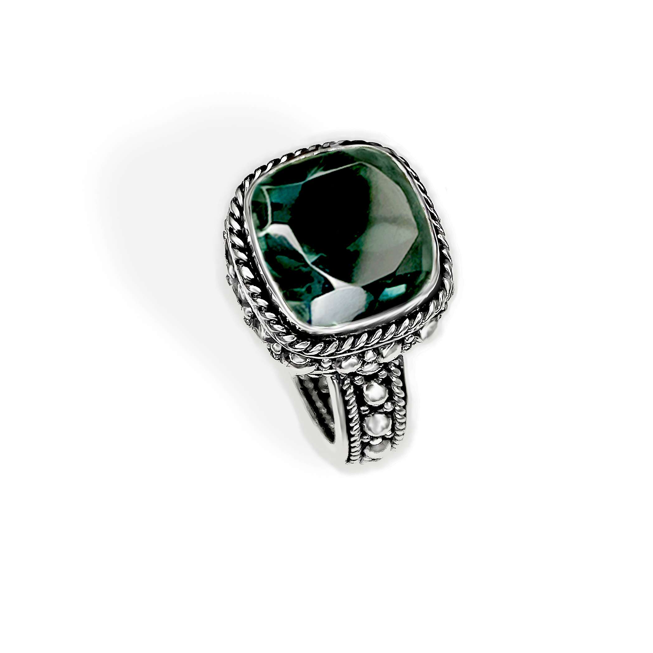 This sterling silver ring features a captivating cushion-cut gemstone, available in Sky blue Topaz, London Topaz, and Green hydro quartz. Framed by intricate beadwork and rope detailing, the gemstone takes center stage, striking the perfect balance between boldness and refinement.