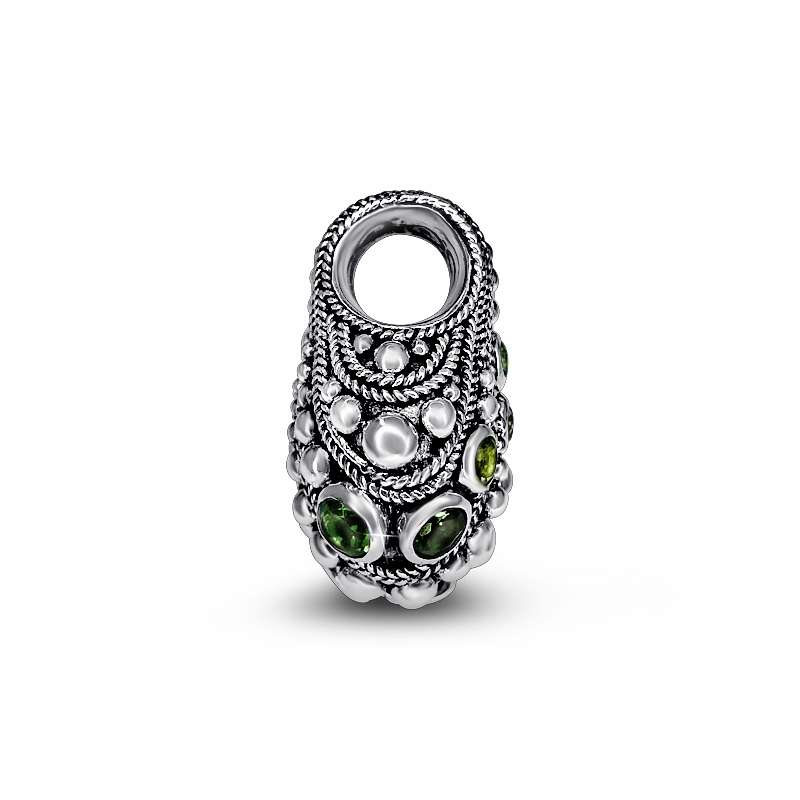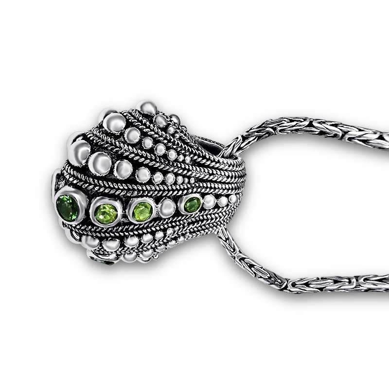 This handcrafted sterling silver pendant features granulated beads and twisted wire details, inspired by the traditional Batak jewelry of Sumatra. Set with a stunning mix of Tsavorites, Diopsides, and Green Quartz, it showcases a rich palette of vibrant green hues. With an approximate weight of 20 grams, this piece is entirely handmade, reflecting expert craftsmanship.