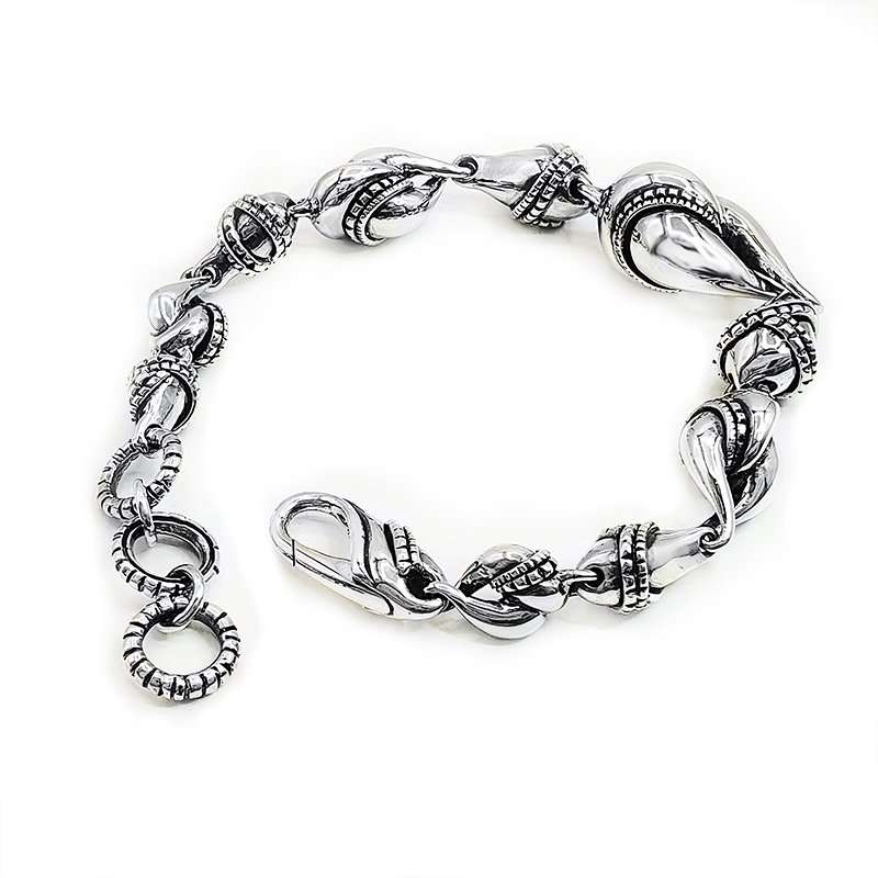The pommel silver bracelet is totally handmade. The high quality craftsmanship is visible in the delicates shapes and smooth surfaces of its component. The length can be adjusted to 17, 18 or 19cm.