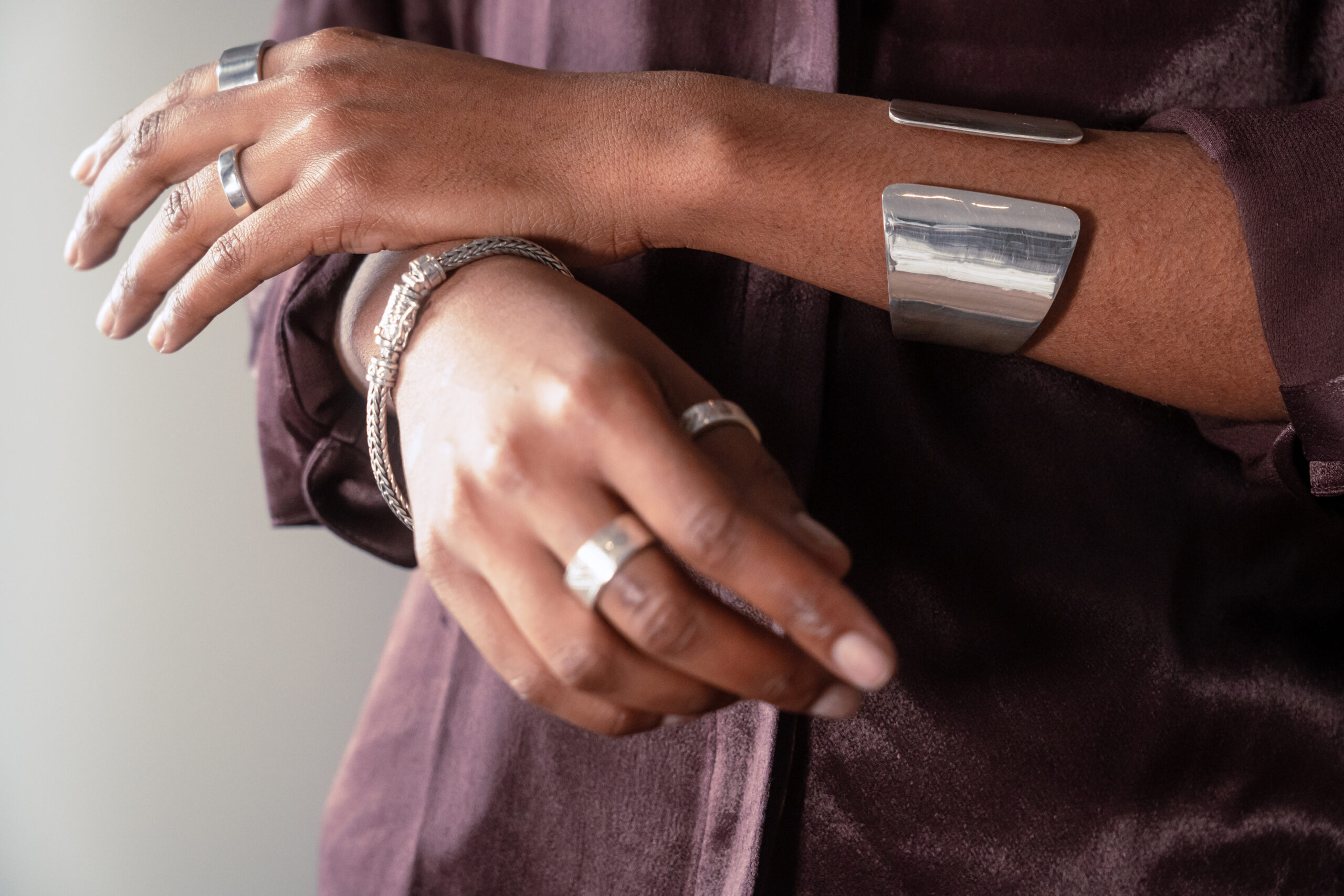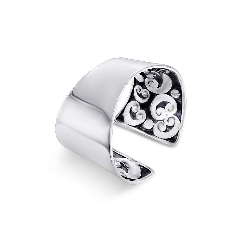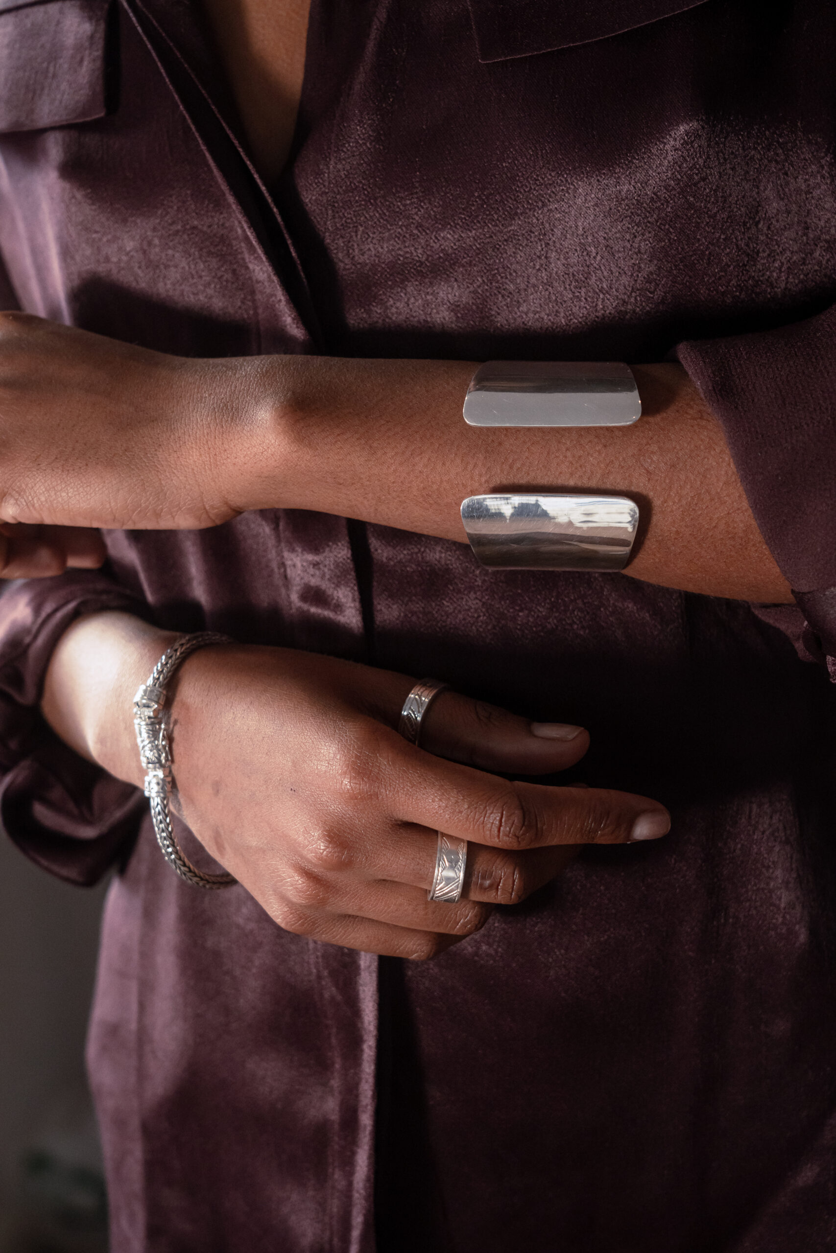 This 999 pure silver cuff is entirely handmade, featuring an intricately engraved interior design inspired by traditional Indonesian craftsmanship. Weighing 84 grams, it boasts a sleek open-ended structure with a 5 cm top width and 2 cm bottom width, blending elegance with artisanal heritage.