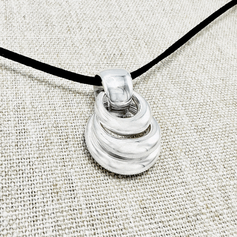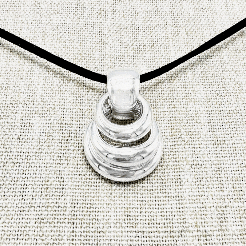 This stunning pendant is composed of three interlocking rings, each with a different diameter, creating a beautifully layered effect from large to small. Entirely handcrafted in pure silver (999), it stands apart from Sterling Silver (925), as it contains no alloys—just pure silver. Weighing approximately 30 grams, this piece offers a bold yet elegant design.