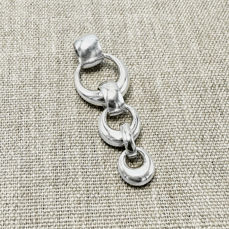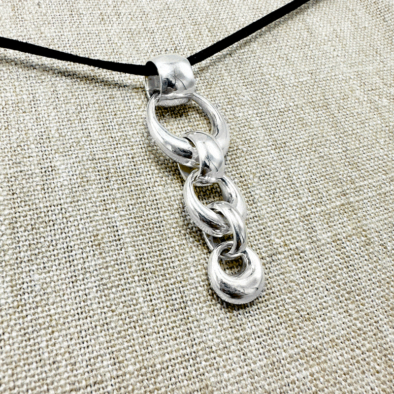 This is the largest and most substantial piece in our collection. Handcrafted from 100% pure silver (999 fine), it features three bold rings shaped using traditional techniques. The 100mm length and 40-gram weight create a striking heirloom-quality pendant with luminous shine.