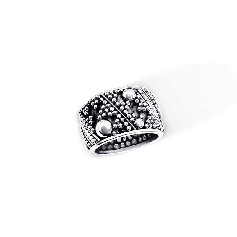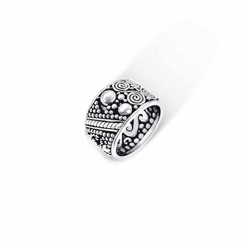 In Bali, the jewelry is elaborated in smaller sizes. Designs with a hundred different patterns are composed. Being specialists in applying little spheres and fine wires by hand, these silver and gold rings became classics among Balinese jewelry.